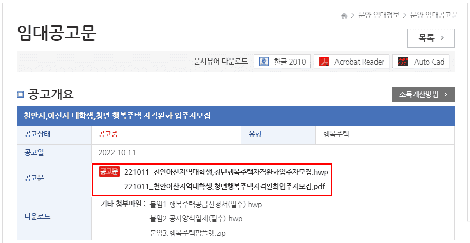 1. 공고 게시글에서 행복주택 관련 정보를 확인합니다.