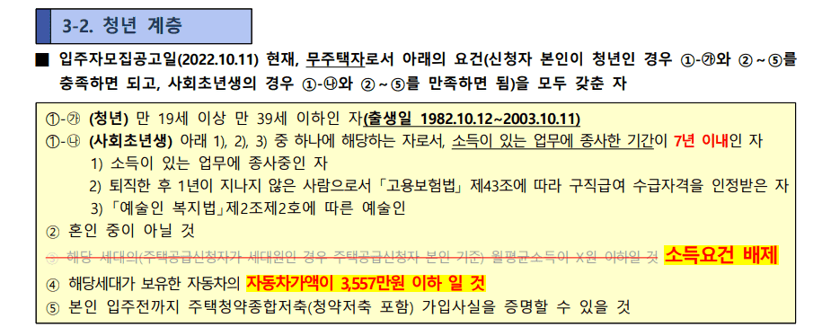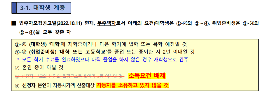 다만, 아래 경우는 제외 - 대학생 계층의 경우 대학 재학, 다음 학기 입학 또는 복학예정자, 대학(또는 고등학교) 졸업(또는 중퇴)한 날부터 2년 이내 - 청년계층의 경우 만 19세이상 만 39세이하, 소득이 있는 업무에 종사한 기간 5년 이내, 주택청약종 합저축 가입 - 신혼부부 한부모가족 계층의 경우 혼인 중일 것, 공급신청자의 혼인기간 7년 이내, 자녀의 나이가 6세이하, 주택청약종합저축 가입 거주기간 중 자격변동으로 공급대상을 변경하여 새로 계약하는 경우에는 확인함
