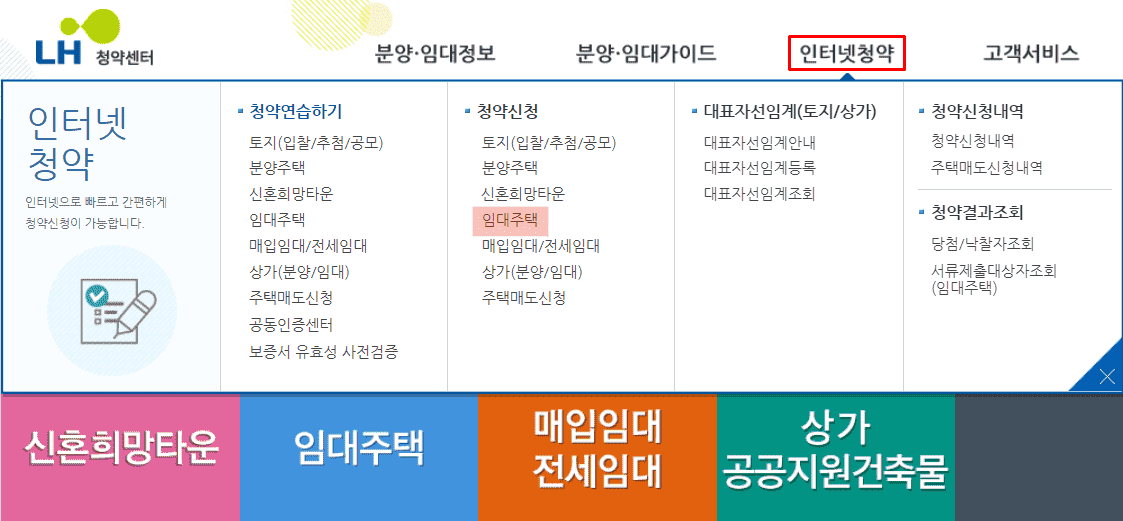 2. 인터넷청약 > 청약신청 > 임대주택을 클릭합니다.