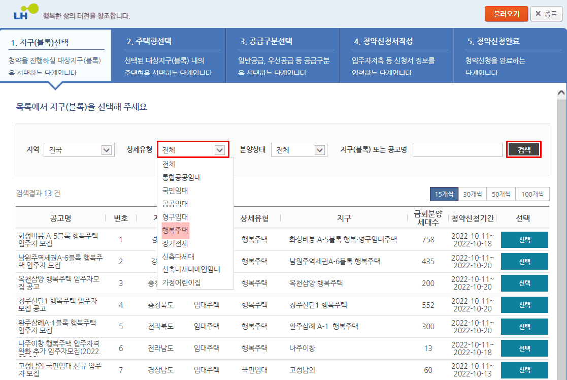 1. 지구(블록)선택 단계에서 상세유형에서 행복주택을 설정합니다.