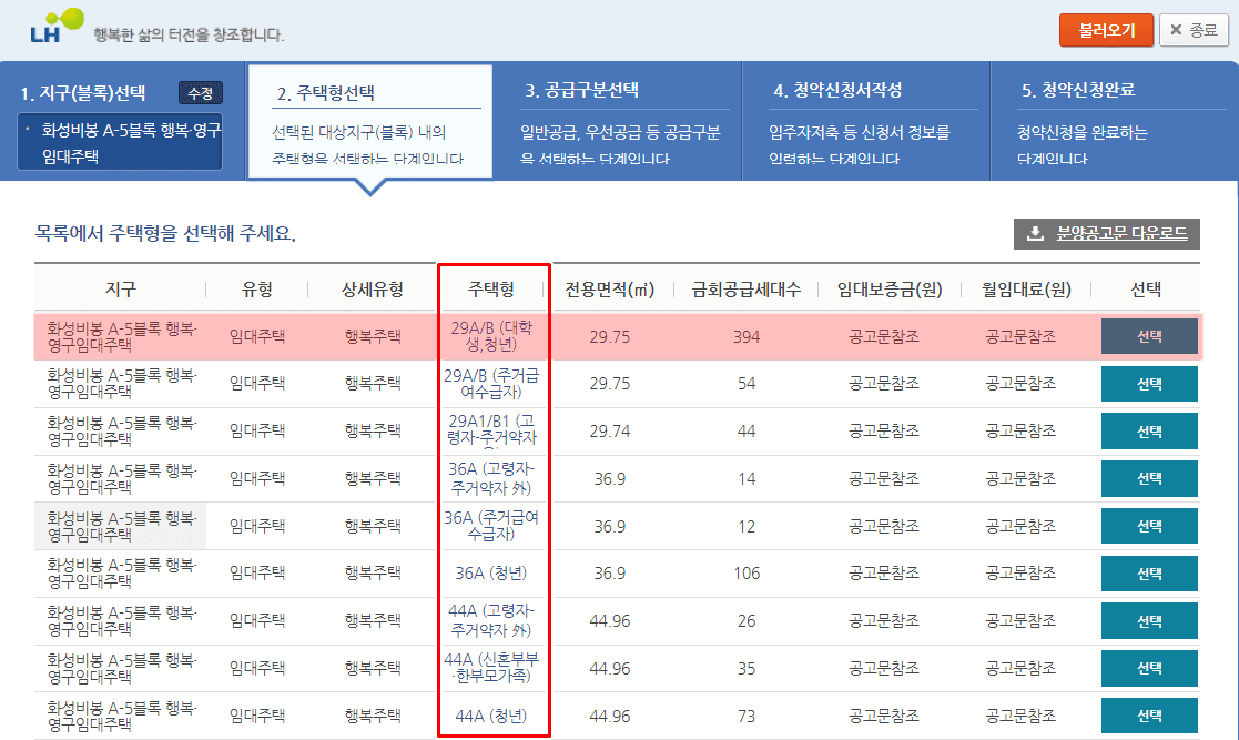 1. 청약을 넣을 주택형을 선택합니다.