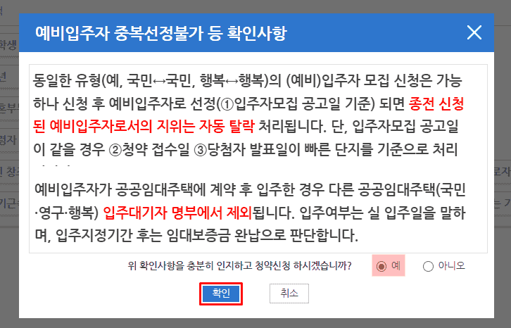 1. 중복선정불가 확인사항 팝업에서 예 체크 후 확인을 누릅니다.