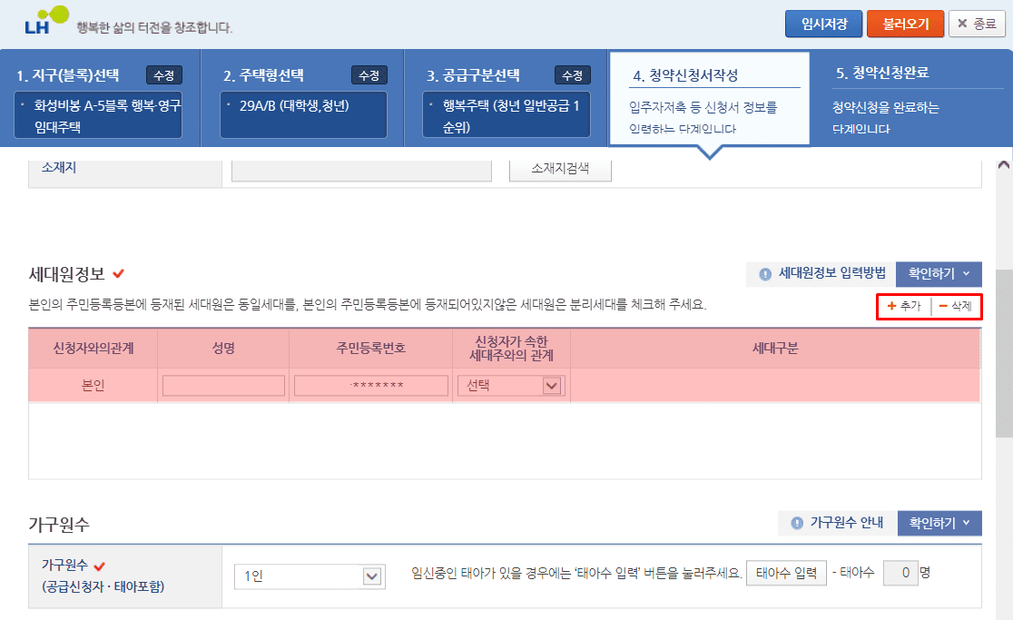 1. 세대원 정보를 추가해서 입력합니다.