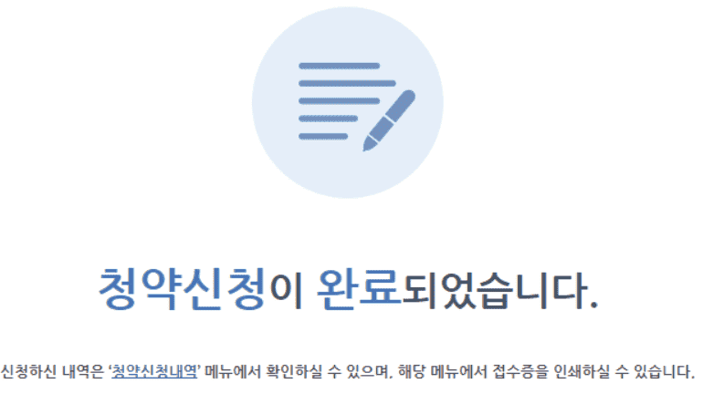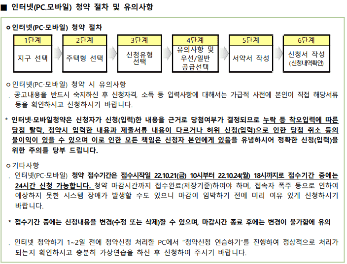 -청약 마감시간까지 접수완료하여야하며, 접속자 폭주 등으로 인하여 예상하지 못한 시스템 장애가 발생할 수도 있으니 마감이 임박하기 전에 미리 여유있게 신청하시길 바랍니다.