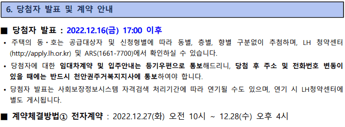 주택의 동/호는 공급대상자 및 신청형별에 따라 동별, 층별, 형별 구분없이 추첨하며 LH 청약센터 및 ARS(1661-7000)에서 결과를 확인할 수 있습니다. 또한 당첨자에 대한 임대차계약 및 입주안내는 등기우편으로 통보되니 당첨 후 주소 및 전화번호 변동이 있을 때에는 반드시 관련 공고문에 적혀진 안내전화로 통보하시길 바랍니다.