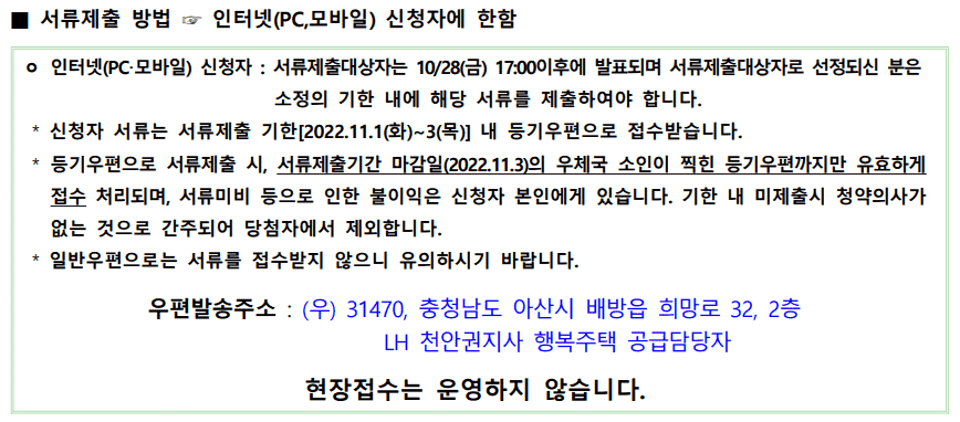 행복주택 청약의 경우 대부분 등기우편 또는 직접방문하여 서류를 제출해야만 합니다. 이 때 공고별로 현장접수를 받는 곳이 있고 받지 않는 곳이 있으니 주의하셔야 합니다. 적혀진 우편발송주소를 확인하시면 됩니다.