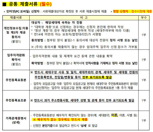LH행복주택 청약시 공통 서류는 모든 유형이 동일하게 준비하시면 됩니다. 이 때 붙임표시가 있는 경우 공고문에 양식이 이미 존재하니 프린트 후 작성하시면 됩니다. 나머지 서류들은 정부24 사이트 온라인 발급이나 가까운 구청/주민센터에서 발급해주세요.