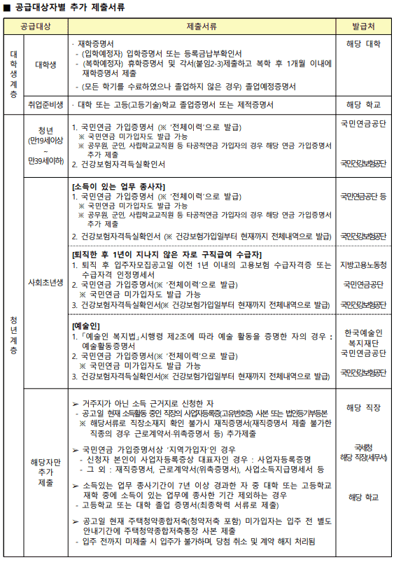 1. 공고문에서 공급대상자별 추가 제출서류를 확인 및 준비합니다.