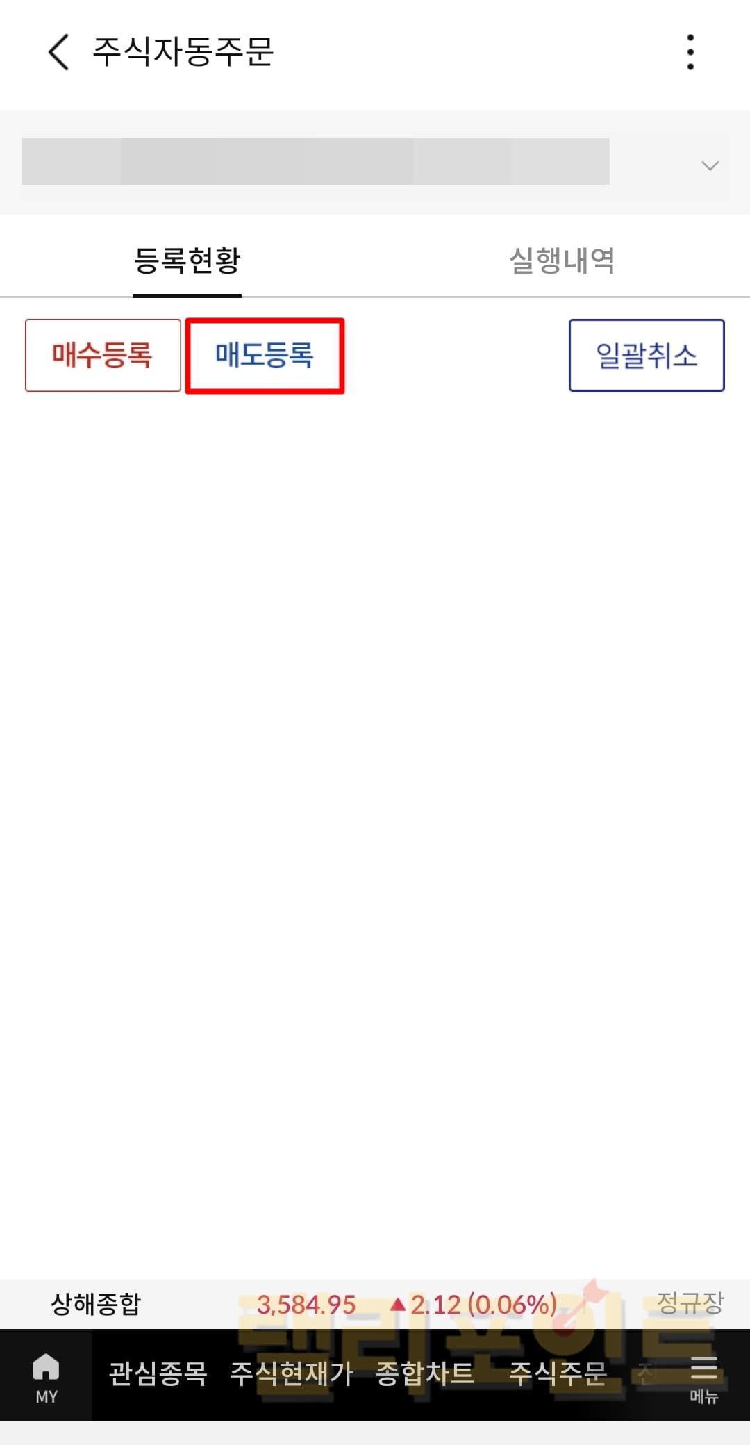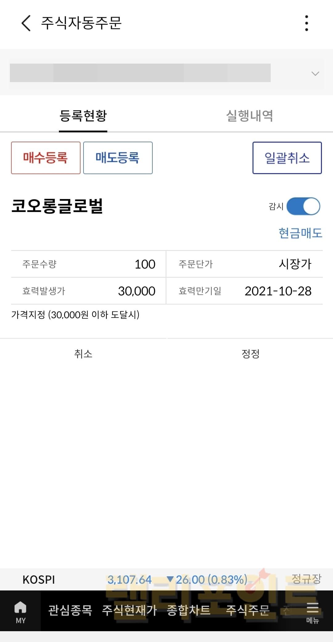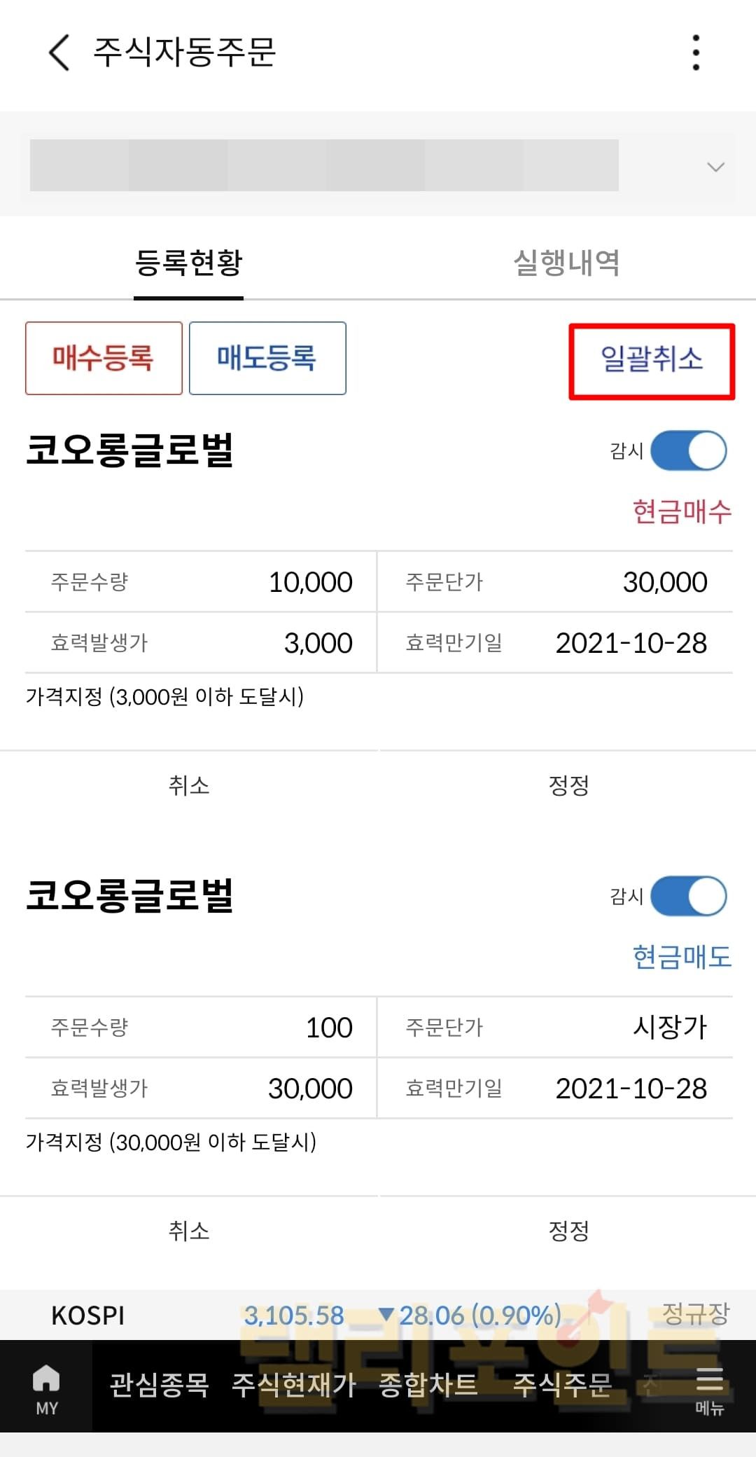 자동주문 메뉴에 진입하면 등록현황이 보여지는데 우측 상단의 일괄취소를 눌러 자동매매 주문을 취소할 수 있습니다. 또한 취소를 하지 않더라도 감시의 바를 왼쪽으로 밀어 비활성화시키면 내가 설정한 조건에 부합된 가격에 도달하더라도 알림 메시지가 오지 않도록 설정도 가능합니다.