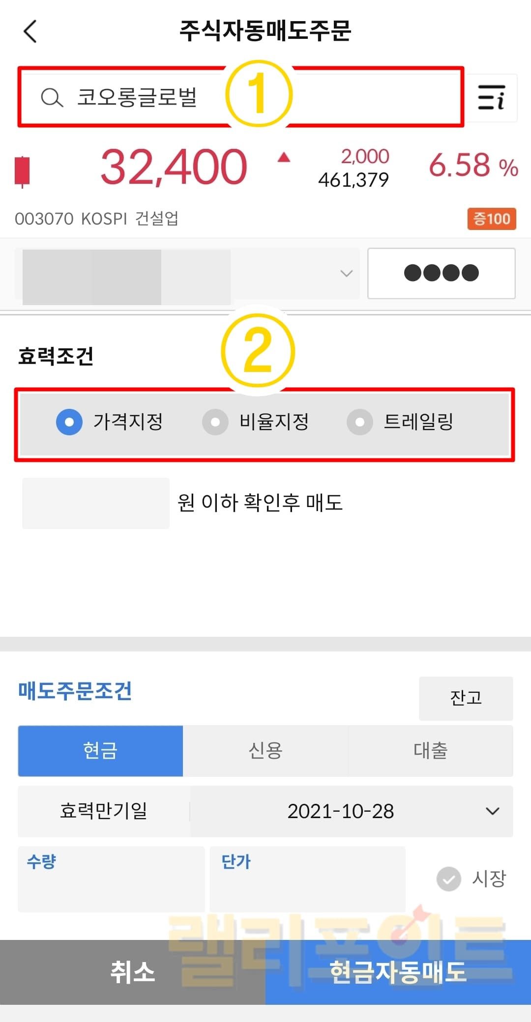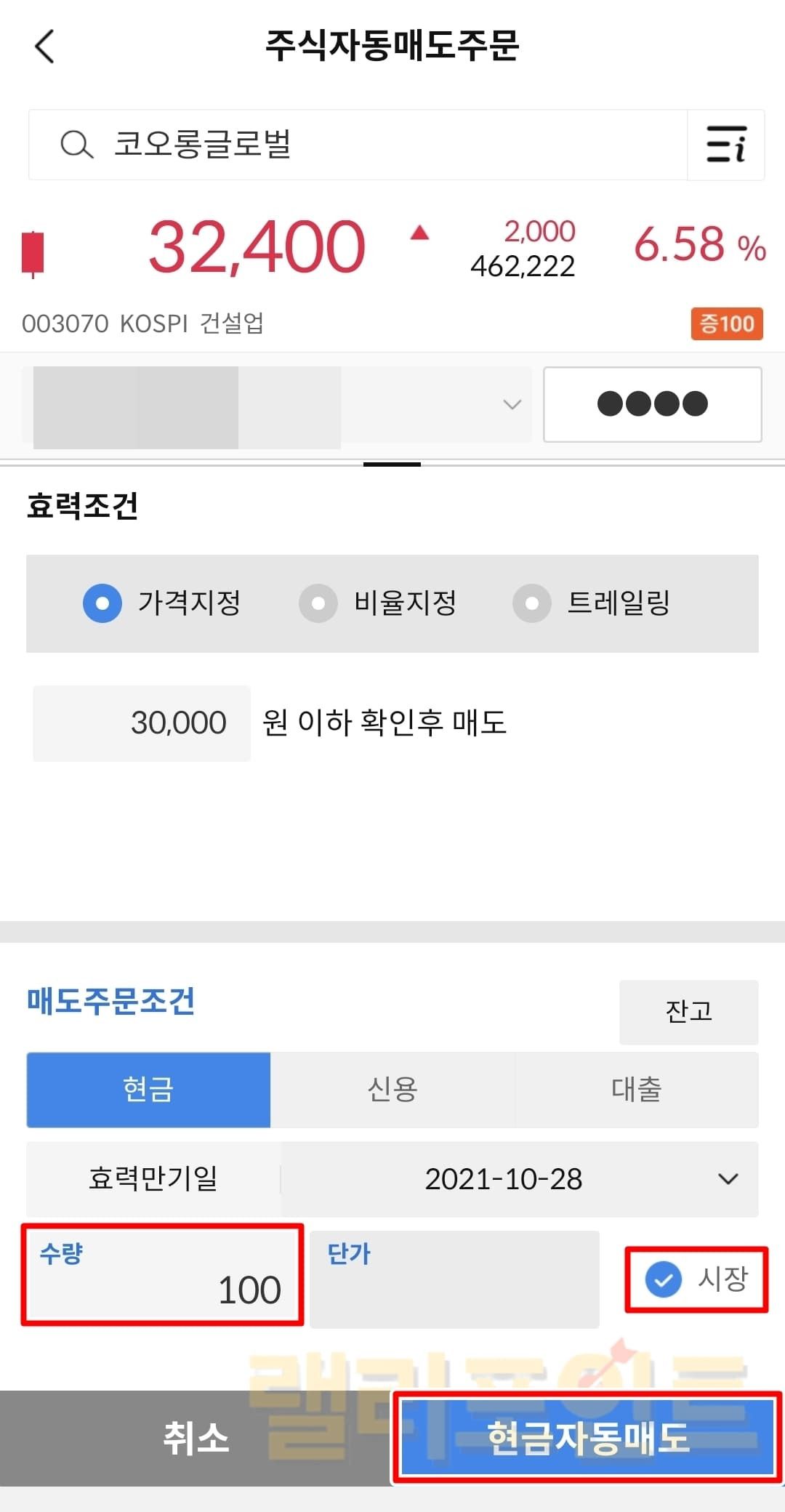 가격지정: 내가 설정한 가격 이하시 확인 후 매도합니다.