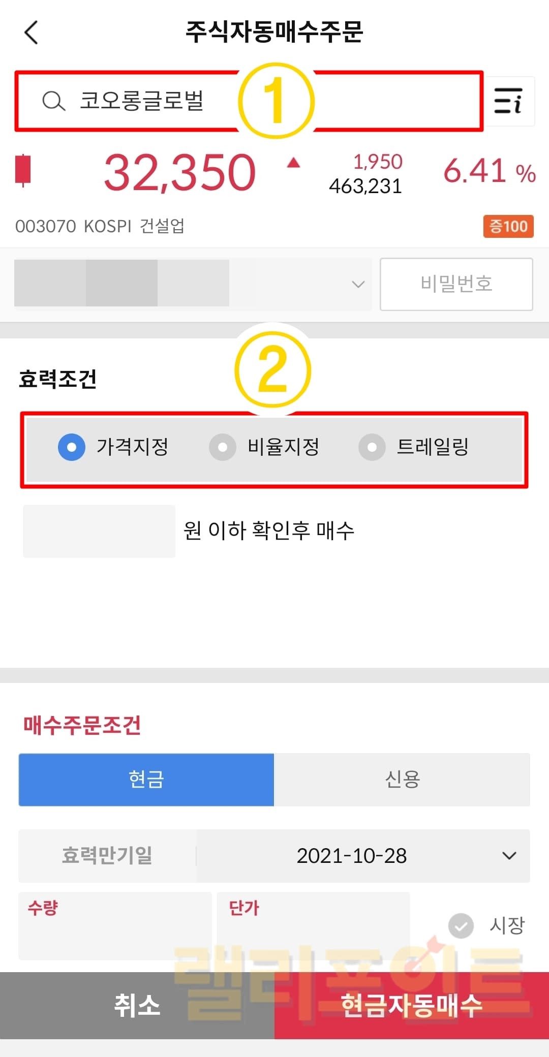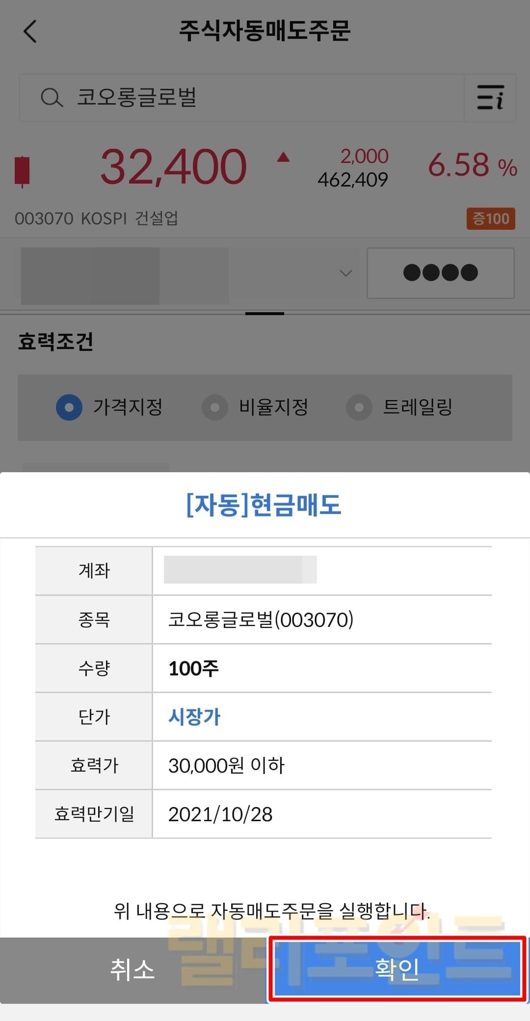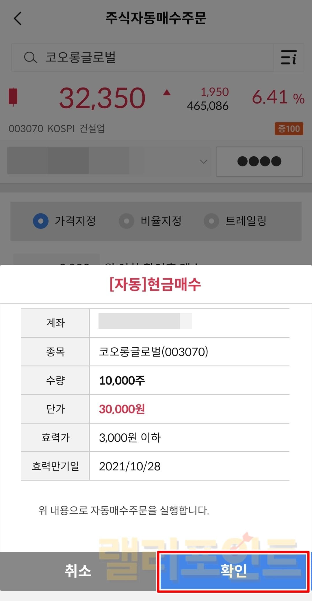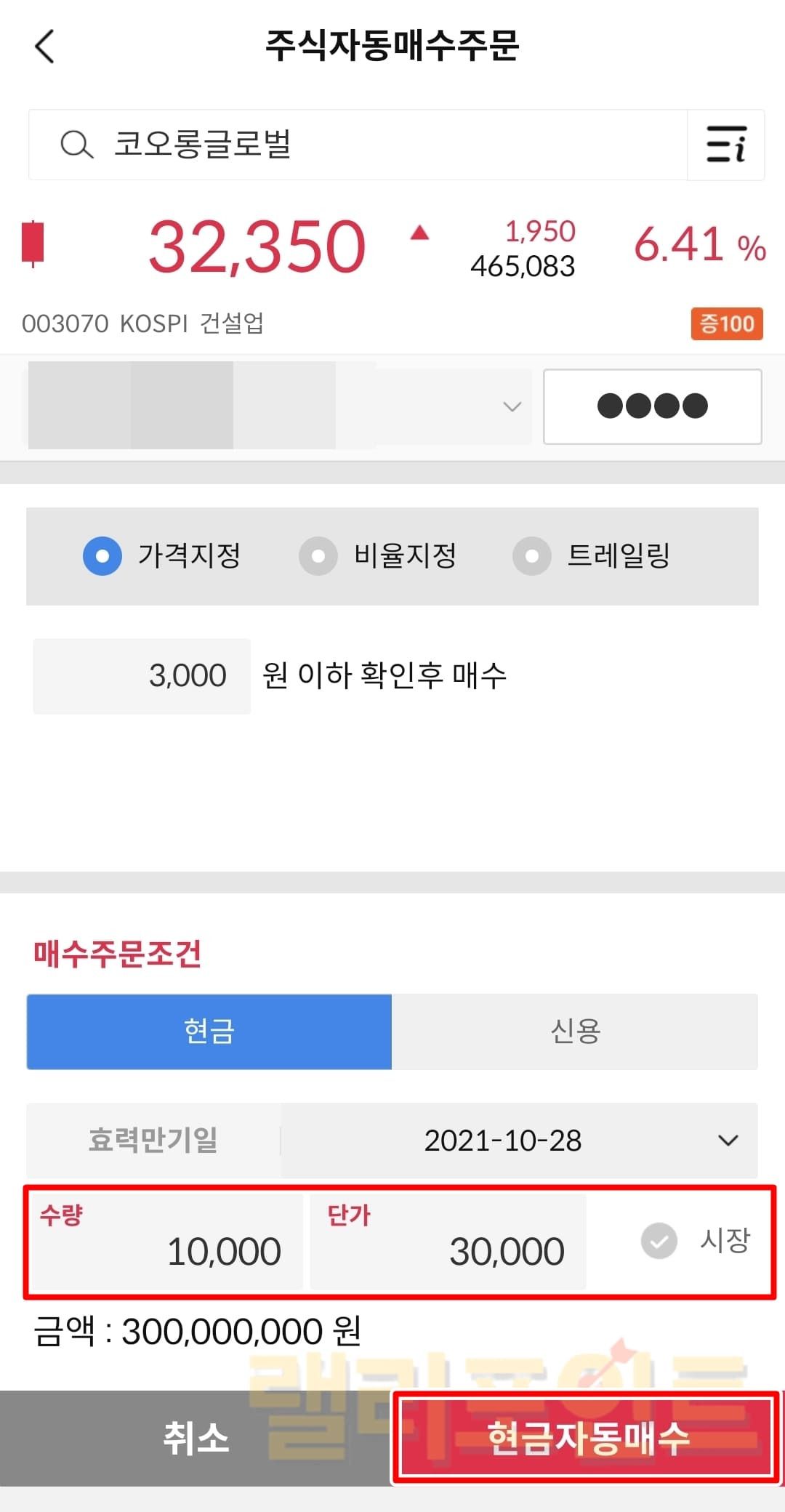 가격지정: 내가 설정한 가격 이하시 확인 후 매수합니다.