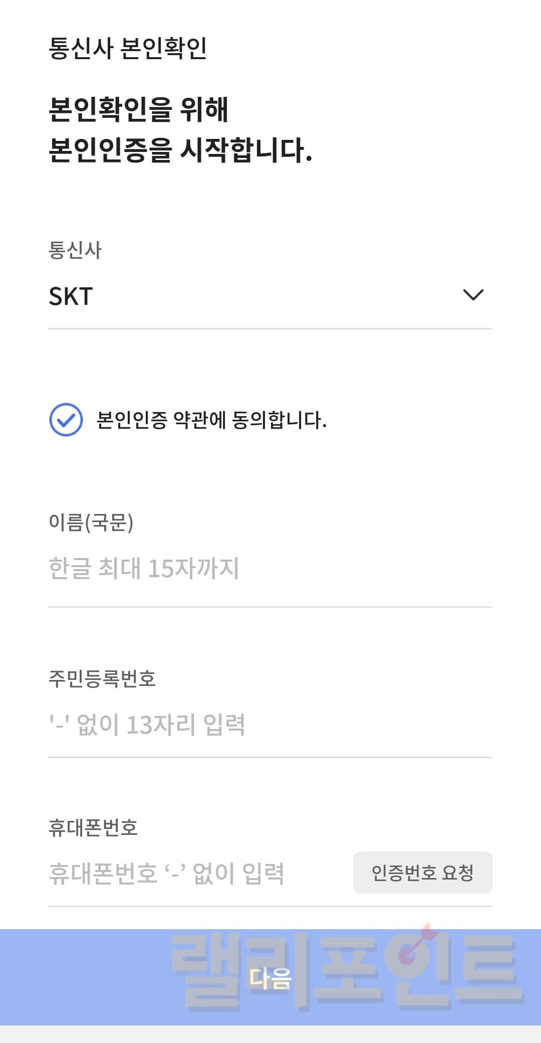통신사, 이름, 주민등록번호, 휴대폰번호를 입력합니다.