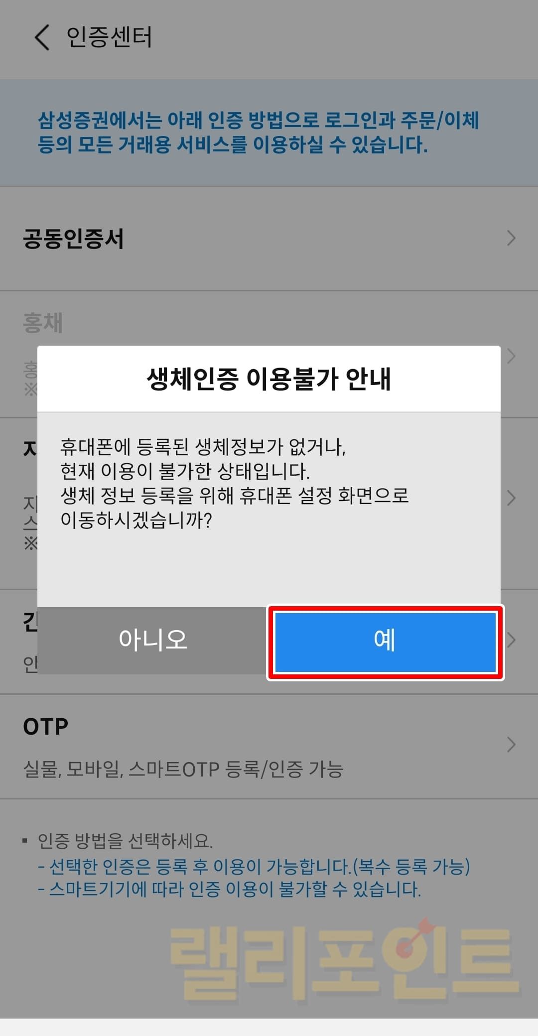 1. 생체인증 이용불가 안내 창에서 예를 누릅니다.