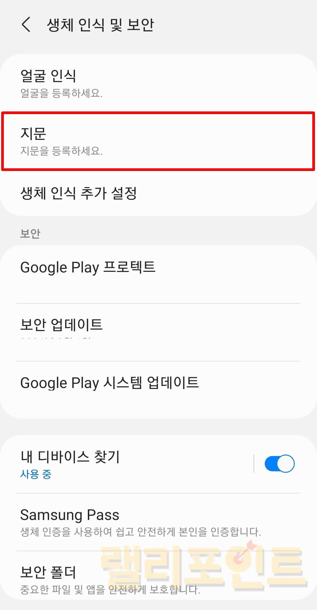 1. 생체 인식 및 보안 페이지에서 지문을 클릭합니다.