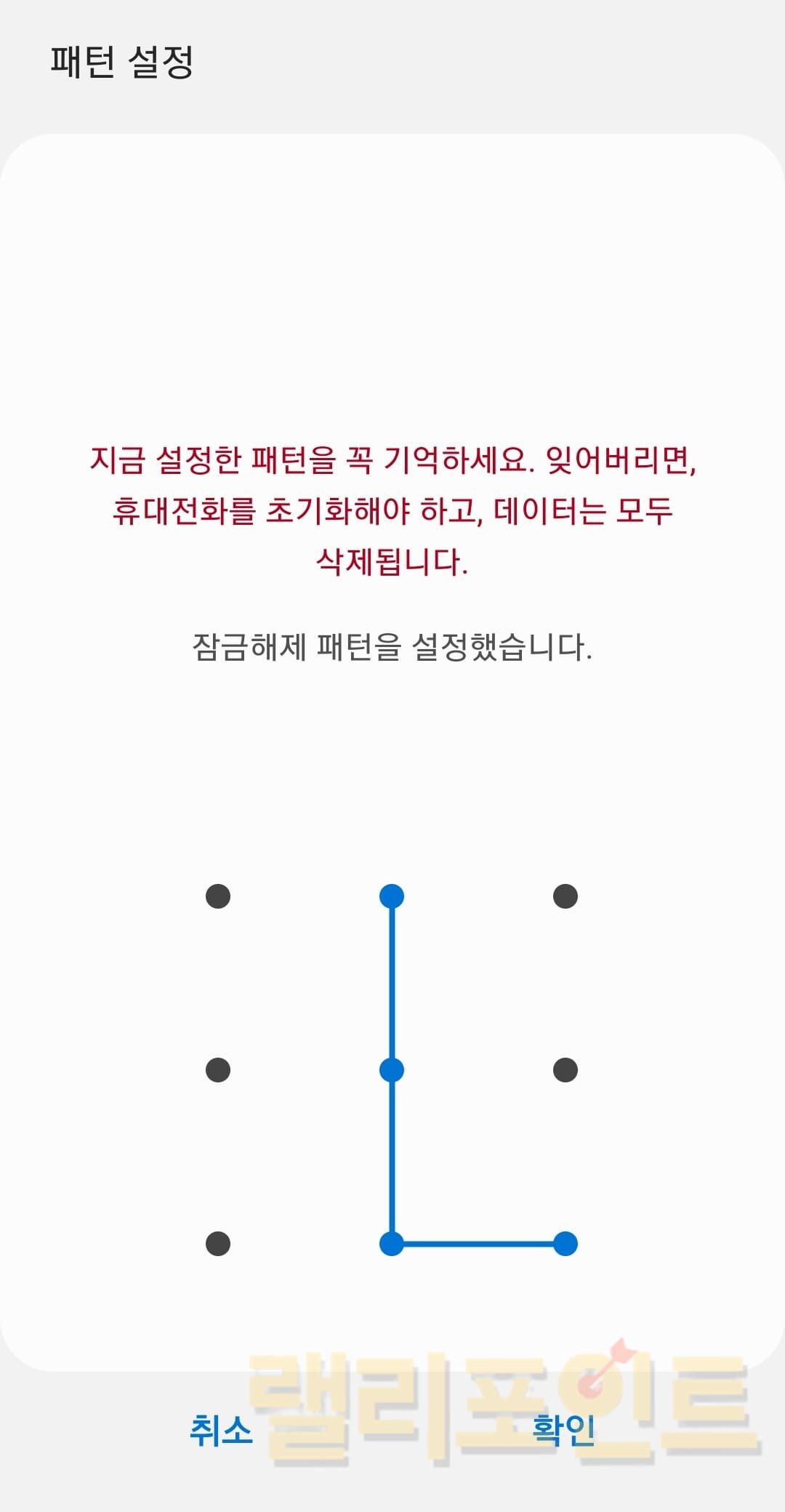 생체인식을 사용하기 위해선 다른 잠금 방식을 함께 이용해야 하기 때문에 설정해주는 절차입니다. 저는 패턴을 선택하였으나 PIN이나 비밀번호로 설정하셔도 무방합니다.