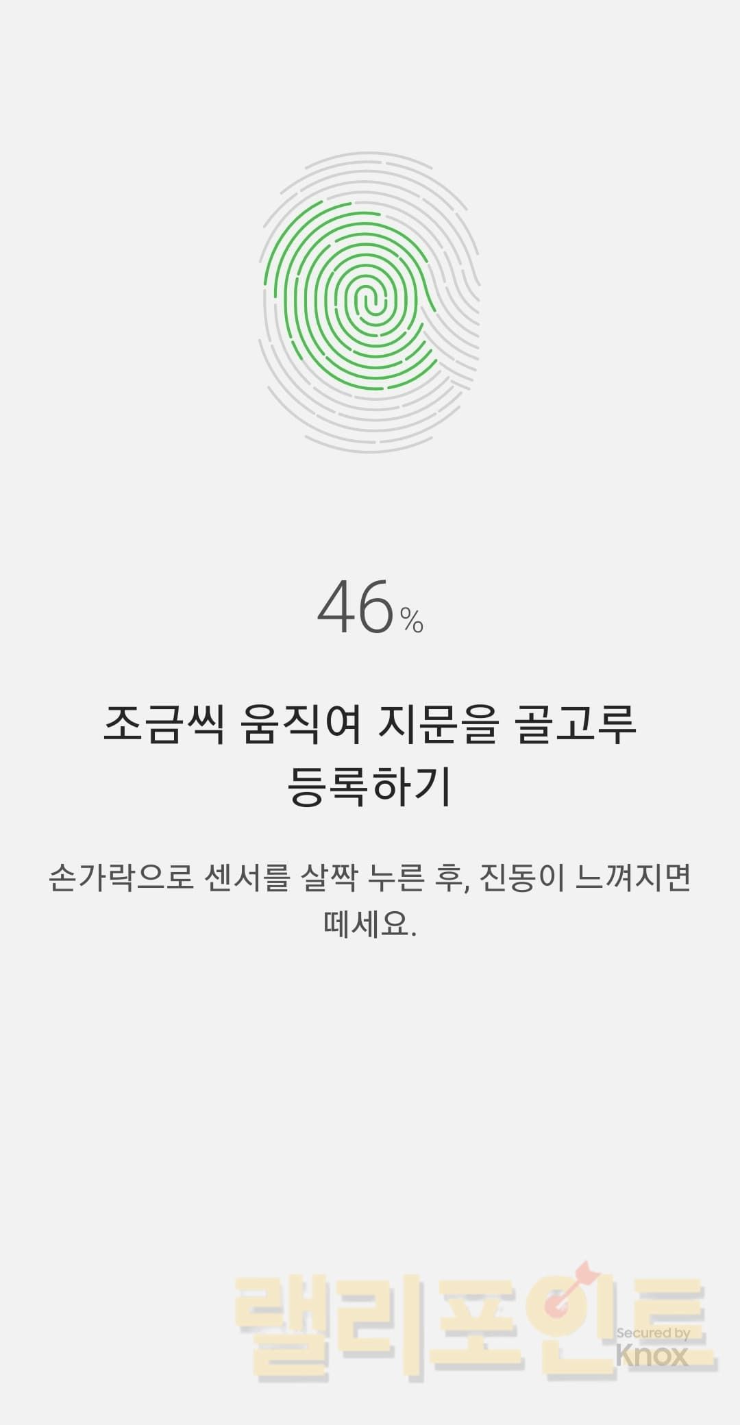 1. 지문 센서에 손가락을 계속 누른 후 떼며 100%까지 등록합니다.