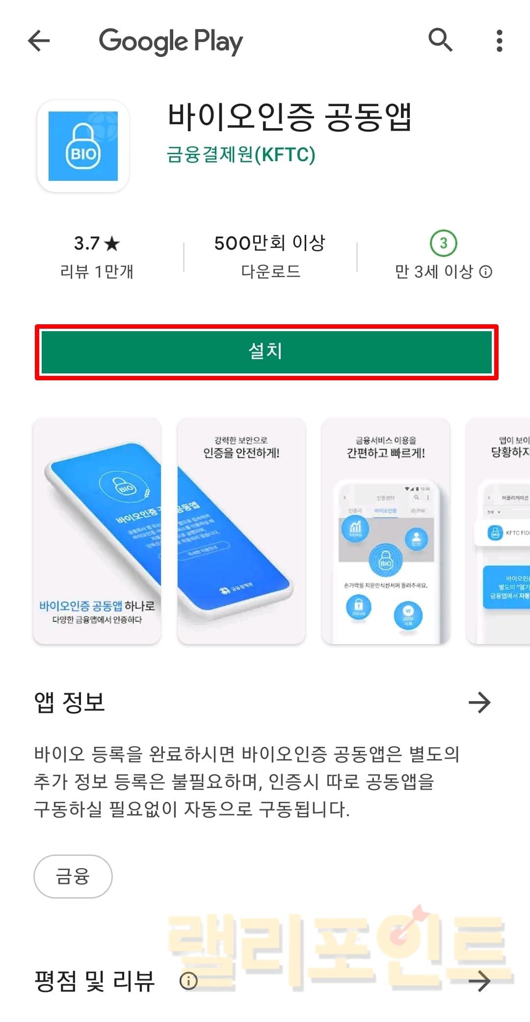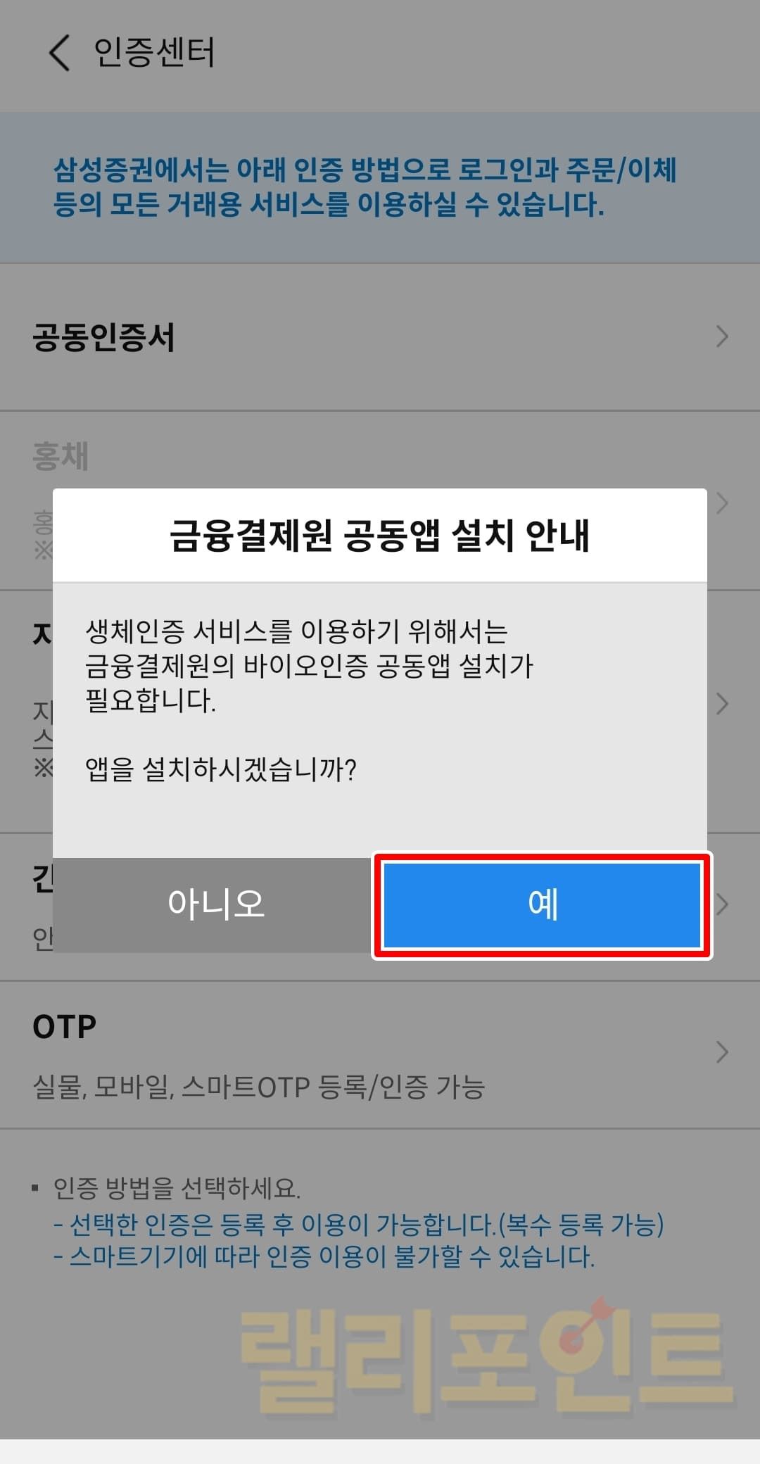 삼성증권 지문인식을 위해서는 금융결제원의 바이오인증 공동 앱 설치가 필요하며 예를 누르면 어플 설치 페이지로 바로 이동합니다.