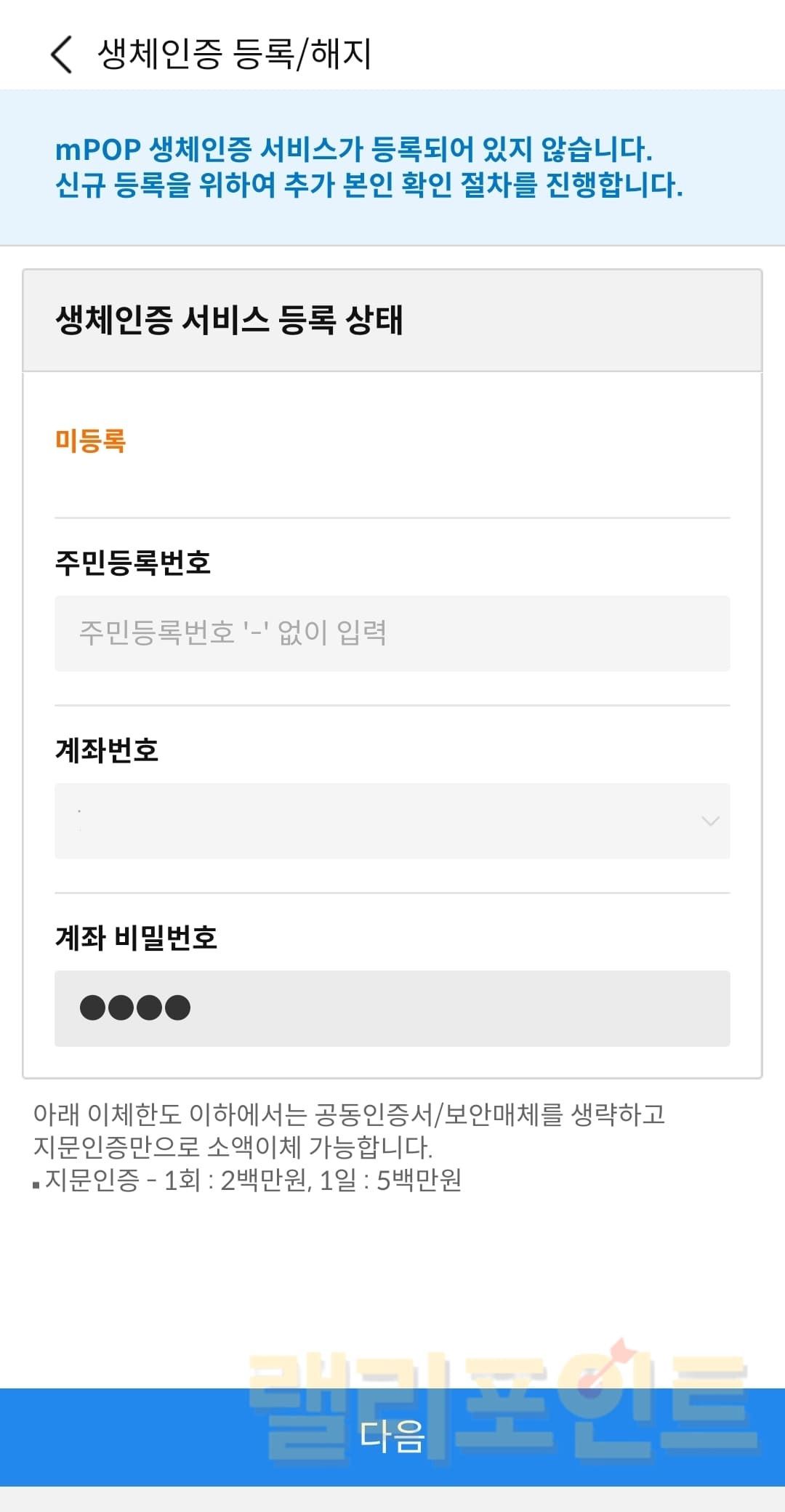 1. 생체 인증 등록 페이지에서 주민등록번호, 계좌번호, 계좌 비밀번호를 입력합니다.