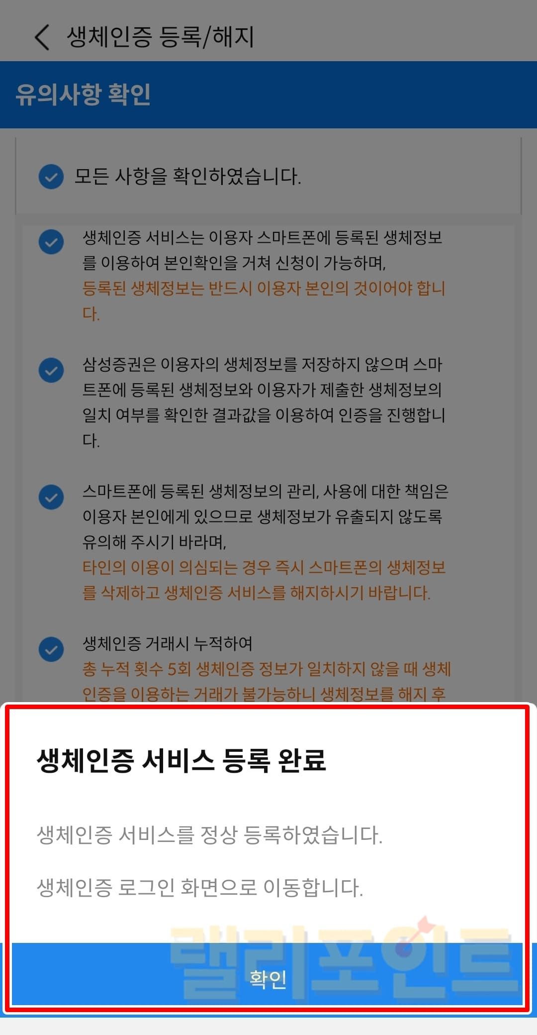 1. 삼성증권 지문 인식이 등록되었습니다.