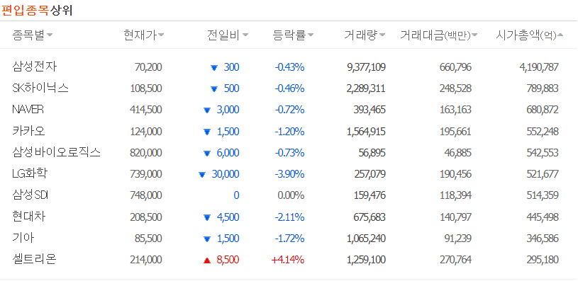 코스피 편입종목 상위를 알아보면 1. 삼성전자 2. SK하이닉스 3. NAVER 4. 카카오 5. 삼성 바이오로직스 6. LG화학 7. 삼성 SDI 8. 현대차 9.기아 10. 셀트리온 순서입니다. 보다시피 대한민국의 상장된 대기업은 모두 코스피시장에 속해져 있습니다. 이것은 코스닥 시장과의 가장 큰 차이점으로 대기업을 제외한 중소기업, 특혜상장기업, 벤처류의 기업은 코스닥시장에 속해져 있다고 생각하시면 됩니다.