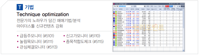 ①기법(Technique optimization): 전문가의 노하우가 담기니 매매기법/분석 및 마이더스툴 신규컨텐츠 강화