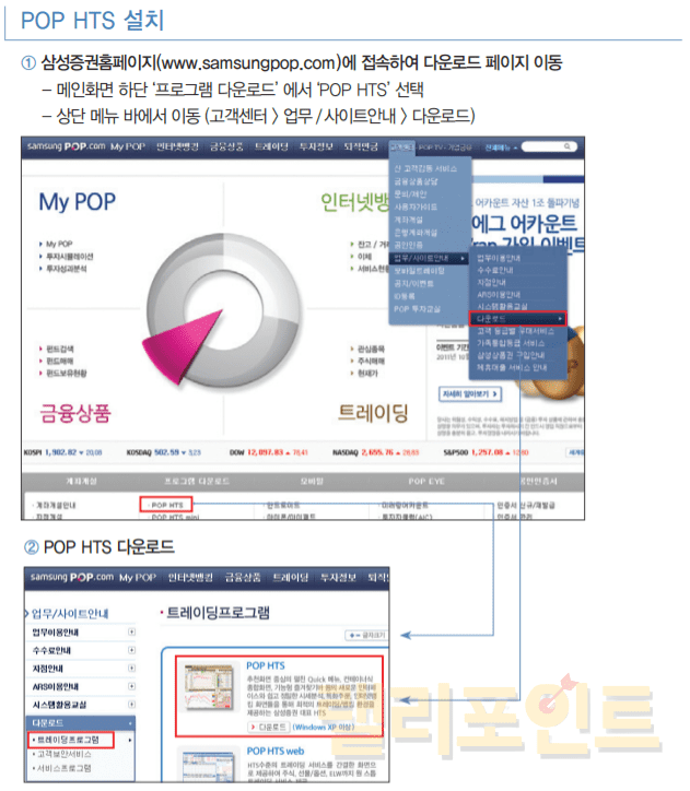 설치는 삼성증권홈페이지(www.samsungpop.com) 접속 후 메인화면 하단의 '프로그램 다운로드'를 누릅니다. 이 후 HTS 또는 DTS를 눌러 설치를 하시면 됩니다.