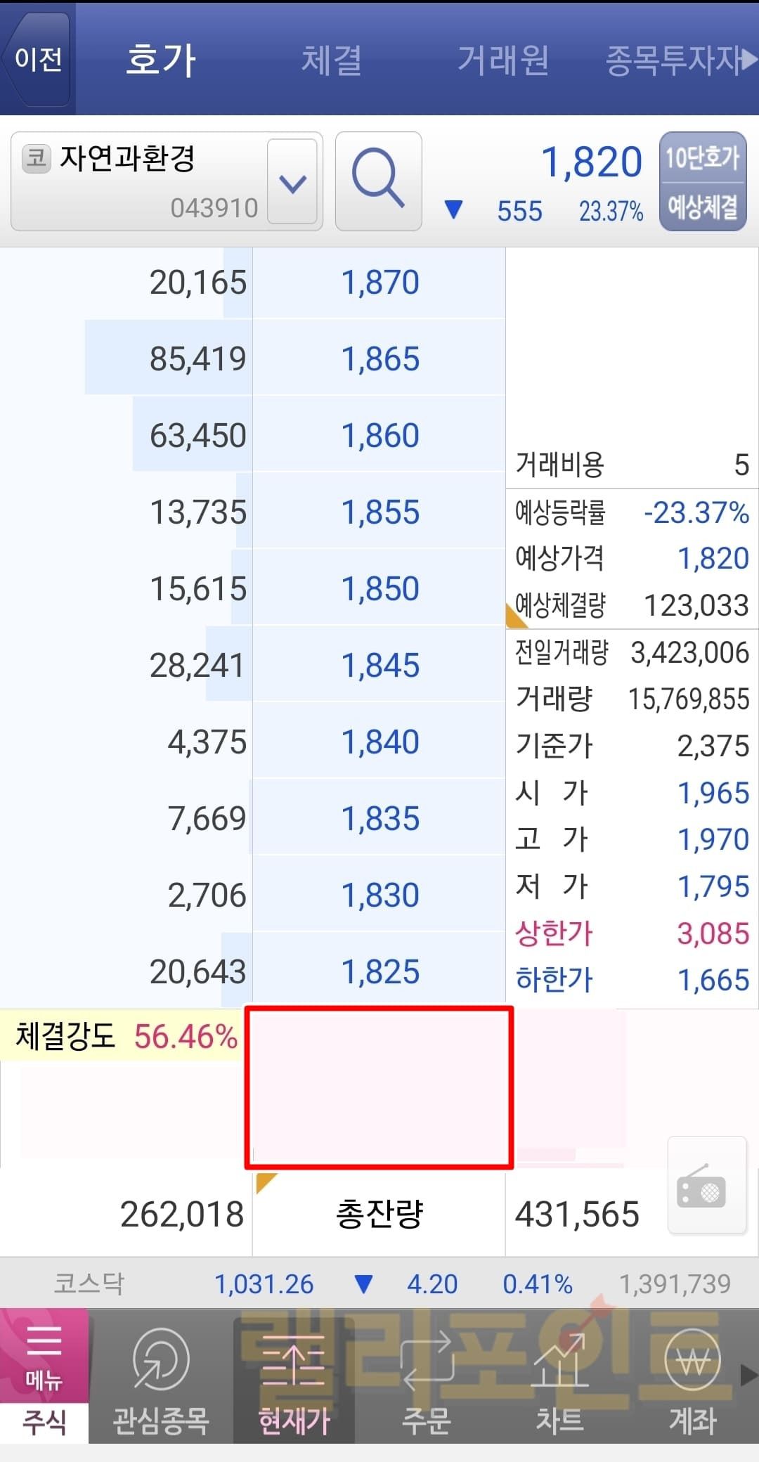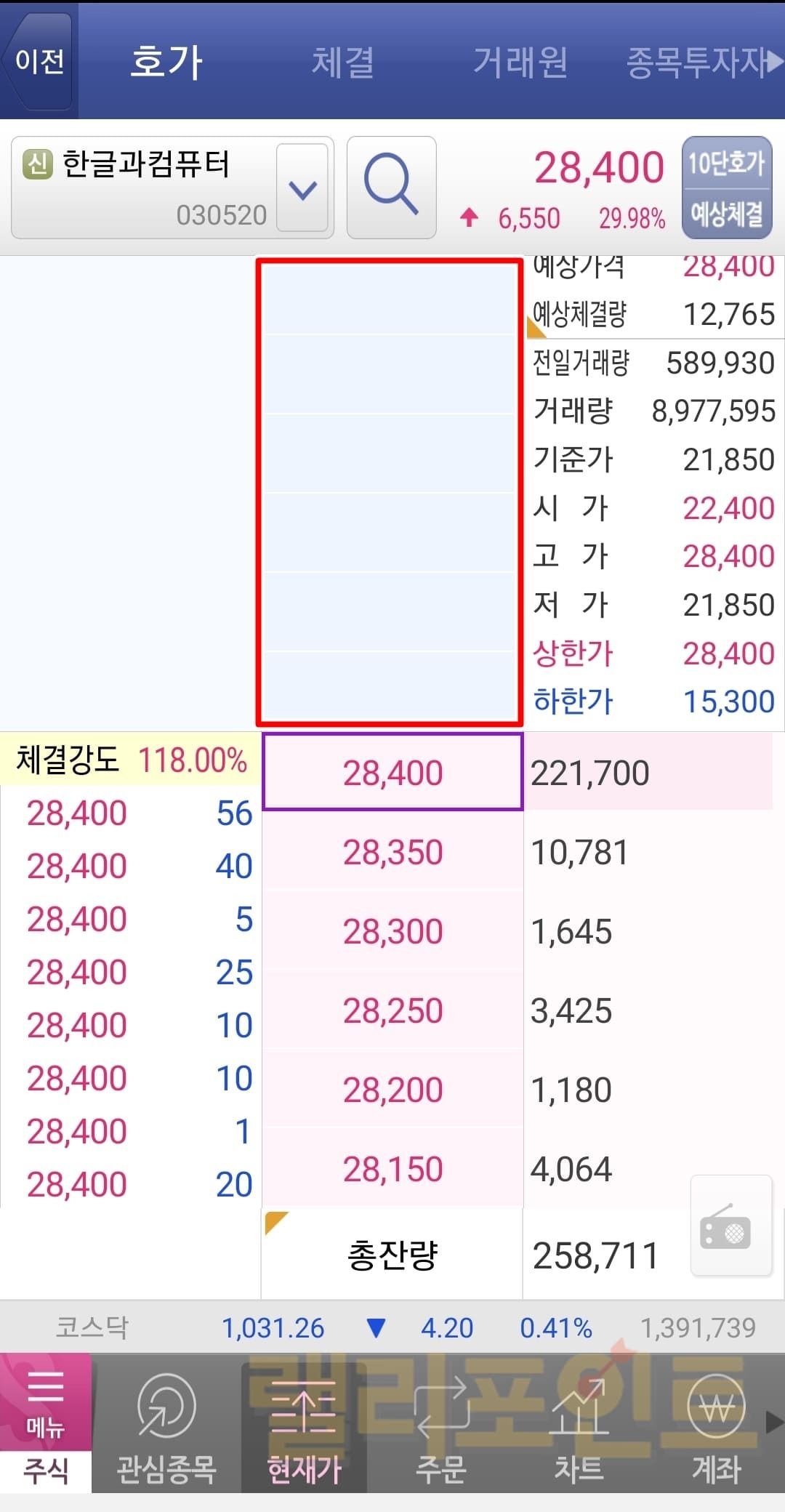상한가를 달성하게 되면 위 사진처럼 상한가보다 더 위의 가격으로는 매수가 불가능합니다. 그래서 보시다시피 상한가 가격 위에는 매도 주문이 전혀 존재하지 않음을 볼 수 있습니다. 보통 상한가를 달성할 정도라면 현재 시장에 노출된 호재가 크다는 것이기 때문에 다음날의 상승을 노려보기 위해서 상한가 가격에 주문을 많이 걸어두곤 합니다. 그래서 호가창을 보면 상한가에 많은 매수 주문이 걸려진 것을 확인할 수 있습니다.