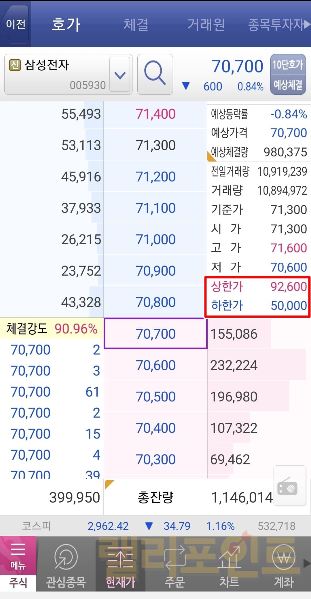 삼성전자의 전일 종가는 71,300원이였습니다. 주식 상한가 하한가 뜻에서 소개드렸듯이 기준점은 전일 종가이기 때문에 +30%, -30%를 해서 계산할 수 있습니다. 그래서 계산을 해보면 71,300원의 30% 상승의 가격은 92,600원, 30% 하락의 가격은 50,000원임을 알 수 있습니다.