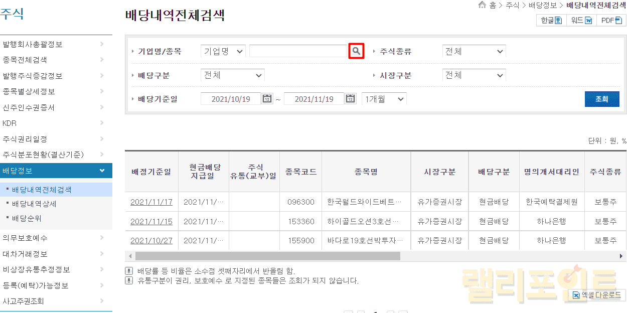 1. 배당기준일 기간을 설정하고 조회를 누릅니다.