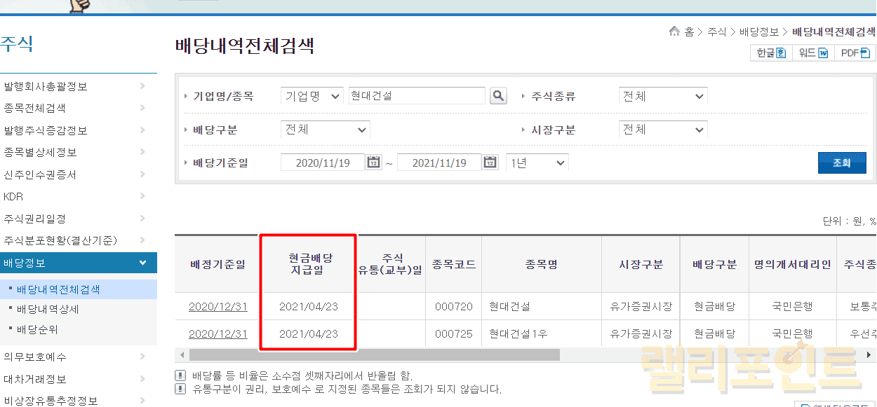 제가 예시로 찾아본 현대건설의 경우 배정 기준일은 12.31일이며 주식 배당금 지급일은 4.23일임을 확인할 수 있습니다.