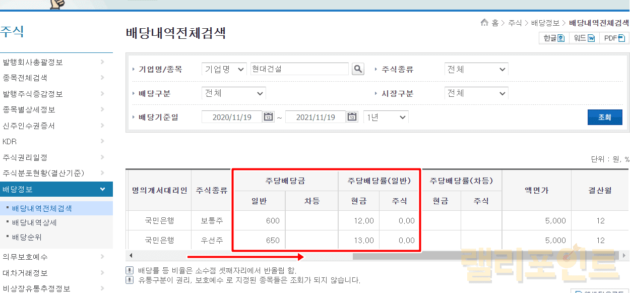 표의 오른쪽으로 이동해보면 주당배당금액과 주당배당률도 확인할 수 있습니다. 현대건설의 경우 600월을 1주당 배당했고 이는 배당률이 12%였음을 알 수 있습니다.