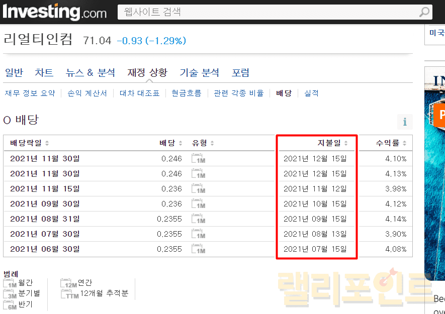 배당락일이 기준일이며, 지불일이 지급일입니다. 위 사진을 보면 최근 11.30일이 배당락일(기준일)이 되었고 12.15일이 지불일(지급일)이 된 것을 볼 수 있습니다. 위 리얼리티인컴의 경우에는 월배당을 주는 대표 주식임으로 1년에 12번의 배당금을 지급합니다.
