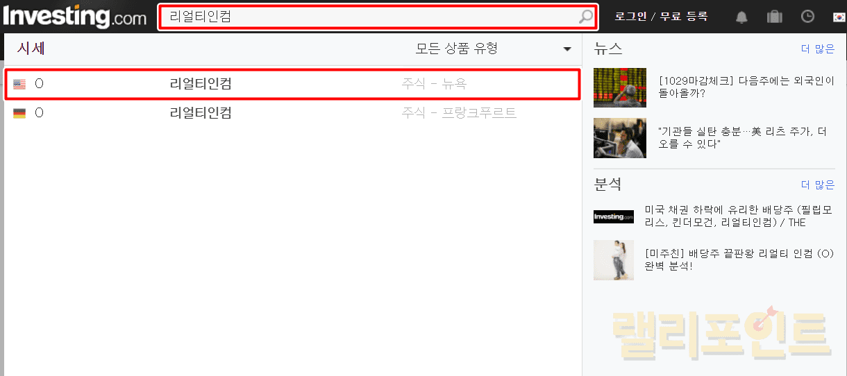 해외 주식의 경우에는 종목코드라는 티커가 존재합니다. 예를 들어서 리얼리티인컴은 O가 티커인데요. 종목명을 굳이 영문으로 작성하지 않고 티커만으로도 쉽게 검색할 수 있고, 한국어로 작성하여도 검색이 가능합니다.