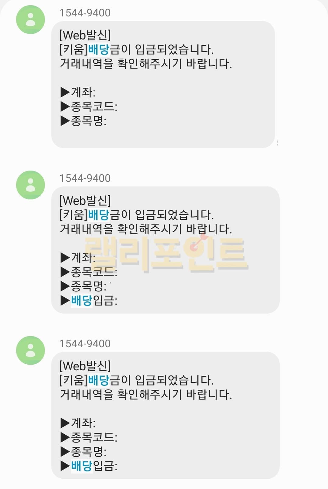 다음은 국내 주식 배당금 지급일에 따른 문자입니다. 기준일에 보유하고 있고 주주총회로 금액과 입금날짜가 확정되면 위와 같이 배당금 입금 예정에 관련된 문자를 수신받을 수 있습니다. 적혀져있는 금액은 증권사에 따라서 15.4%가 선차감된 순수 입금액이거나, 15.4%가 빠지지 않은 금액입니다.