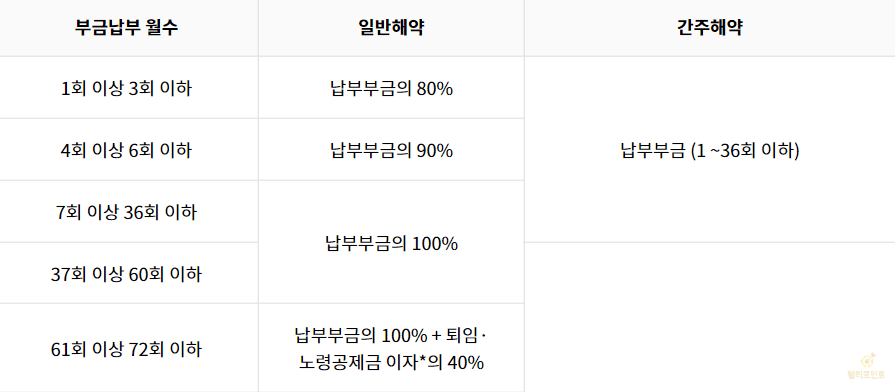 노란우산공제의 단점이라고 한다면 계약된 대로 정상적인 사업의 폐업과 관련되어 돈을 환급받는 것이 아니라, 자유의사에 따른 계약 해지나 돈을 제대로 납부하지 않아서 발생하는 강제해약시에는 해약금을 물어내야 한다는 것입니다. 그래서 부금납부 월수에 따라서 조기 해약시 원금손실이 발생할 수 있다는 것이 노란우산공제의 가장 큰 단점이라고 할 수 있습니다.