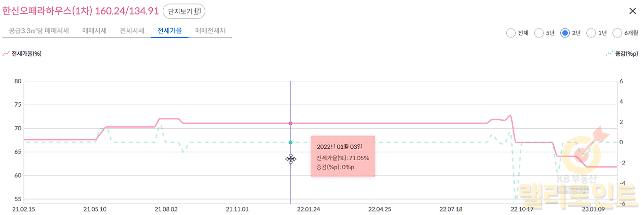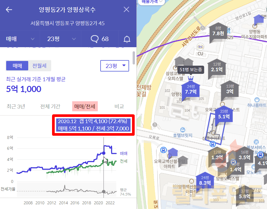 스마트폰이나 PC에서 호갱노노를 이용하면 쉽게 전세가율을 조회할 수 있습니다. 호갱노노로 보고 싶은 부동산 매물을 검색하신 후 매매/전세를 클릭합니다. 이곳에서 매매가와 전세가가 차트에 함께 표시되어 있으며 차트의 특정 지점을 누르면 전세가율과 갭 가격(매매-전세)을 확인할 수 있습니다.