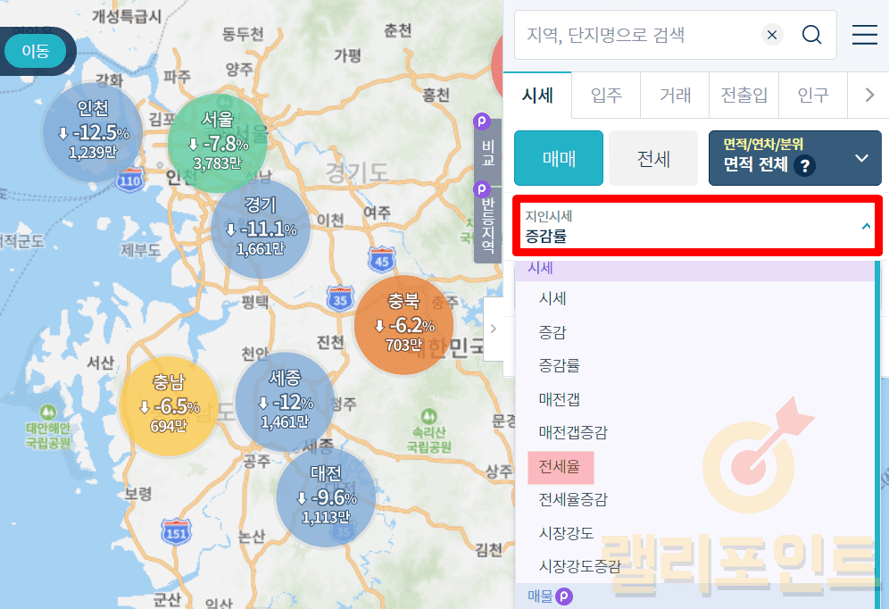 - 부동산지인 빅데이터지도에서 전세가율 조회하기