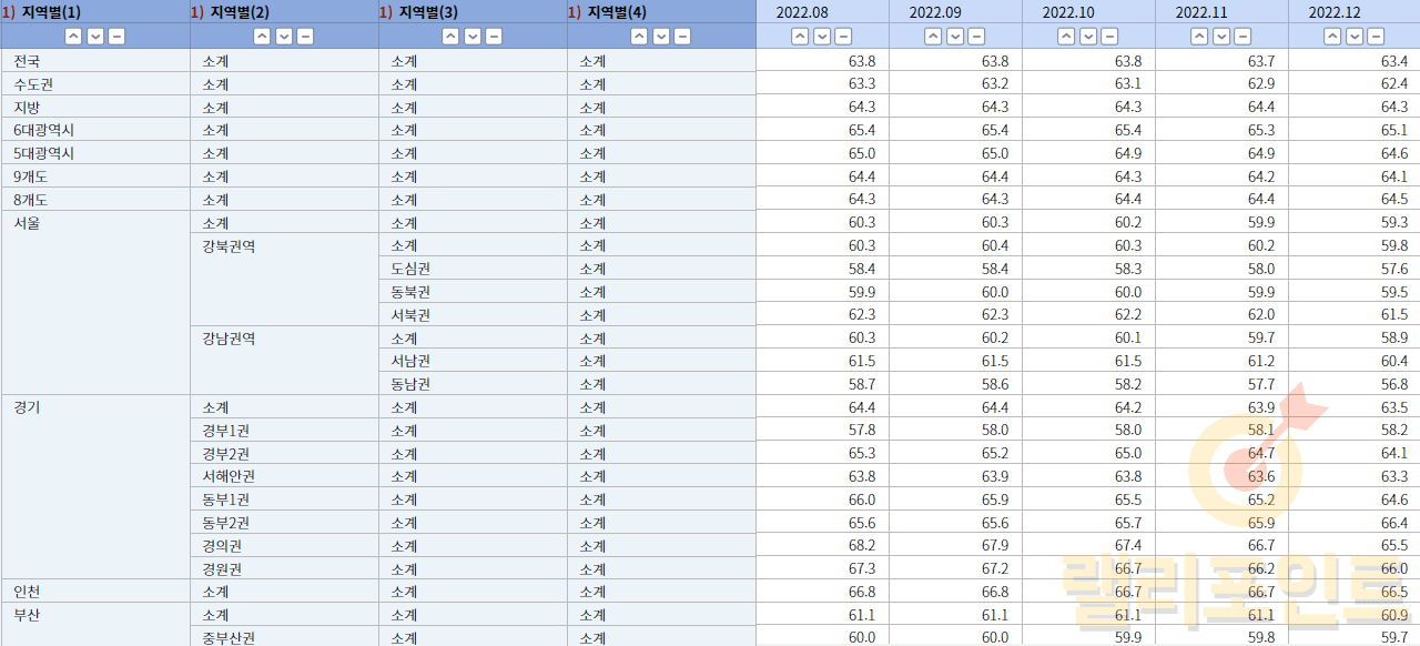 - 각 지역의 기간별 부동산 전세가율을 확인합니다.