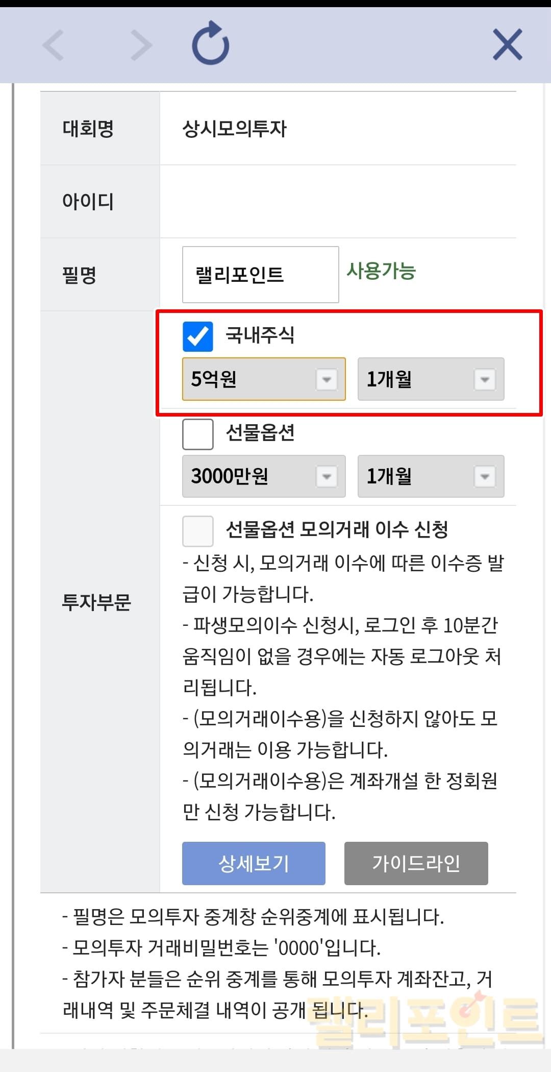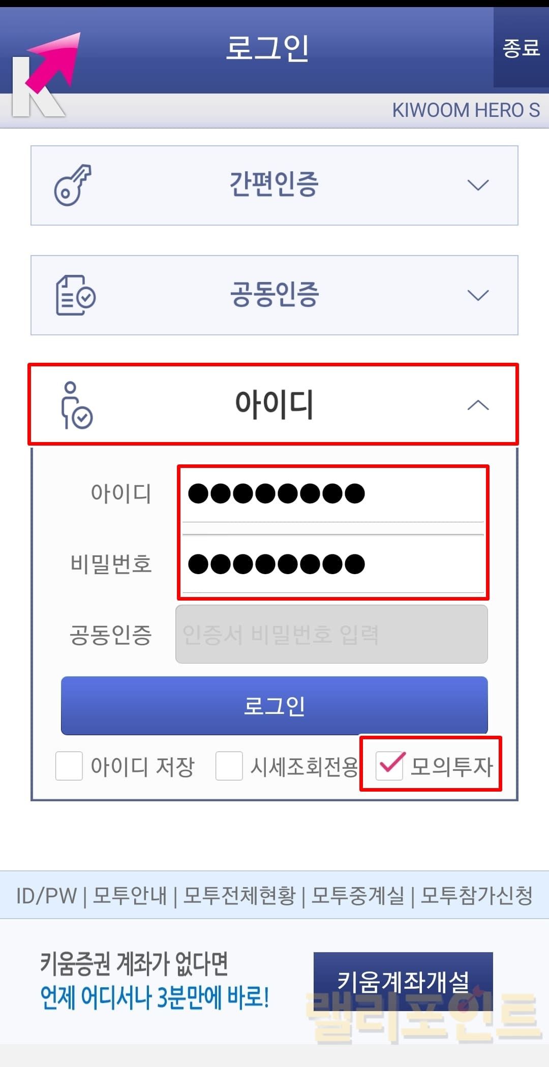 아이디, 비밀번호를 입력하고 모의투자를 체크해서 로그인합니다.