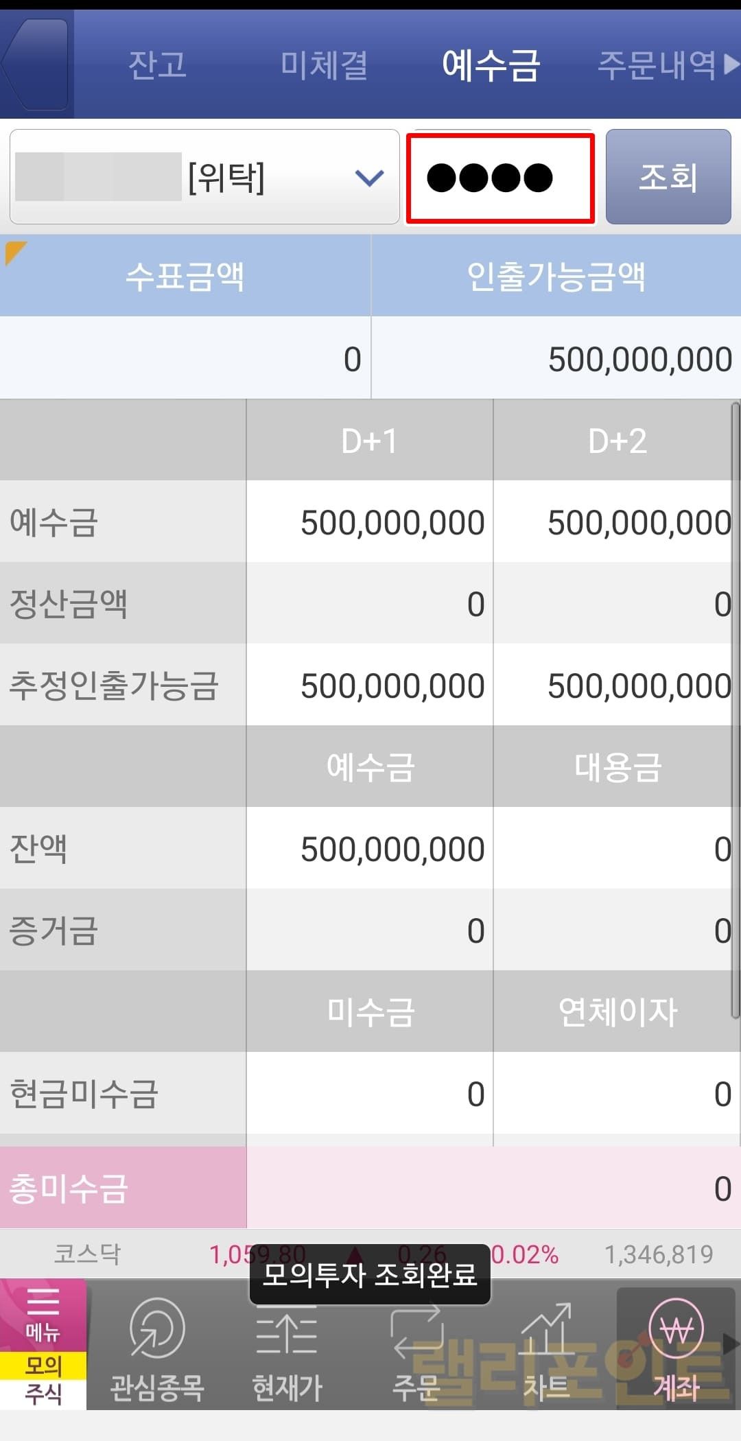 - 계좌비밀번호 0000을 입력해서 나의 잔고, 예수금을 확인할 수 있습니다.