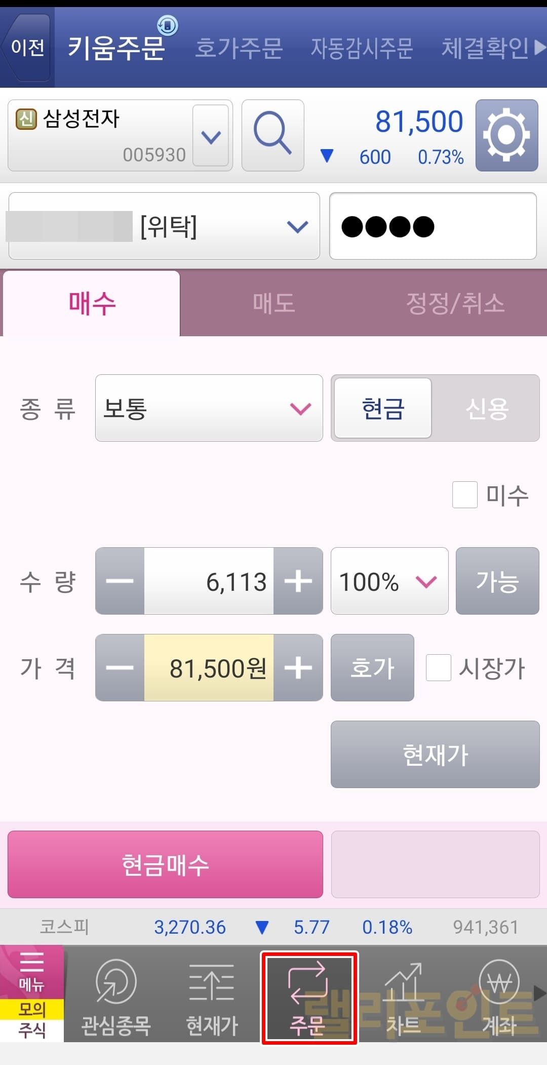 주문을 누르고 수량, 가격을 입력해서 매수, 매도가 가능합니다.