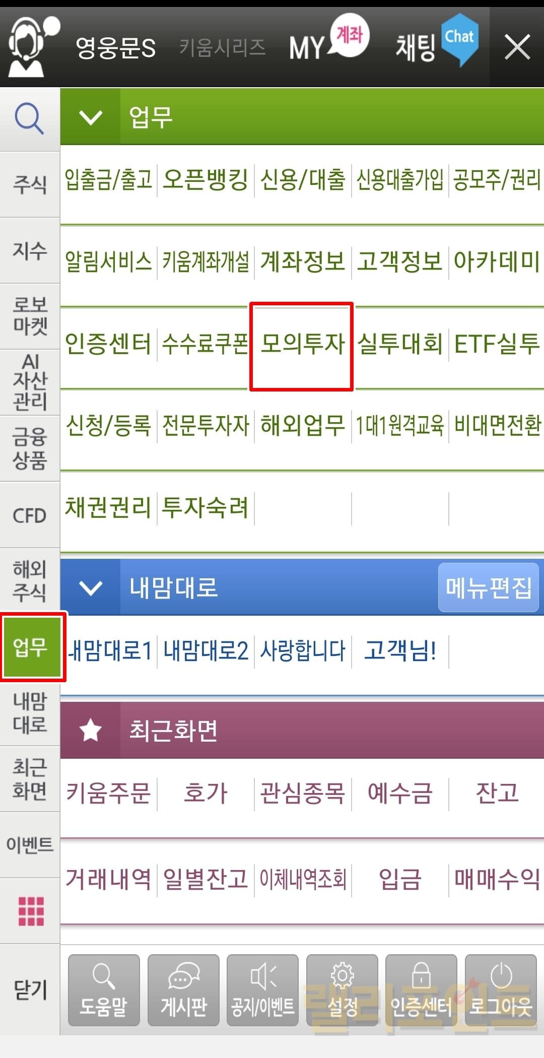 - 영웅문S 메뉴 > 업무 > 모의투자를 클릭합니다.
