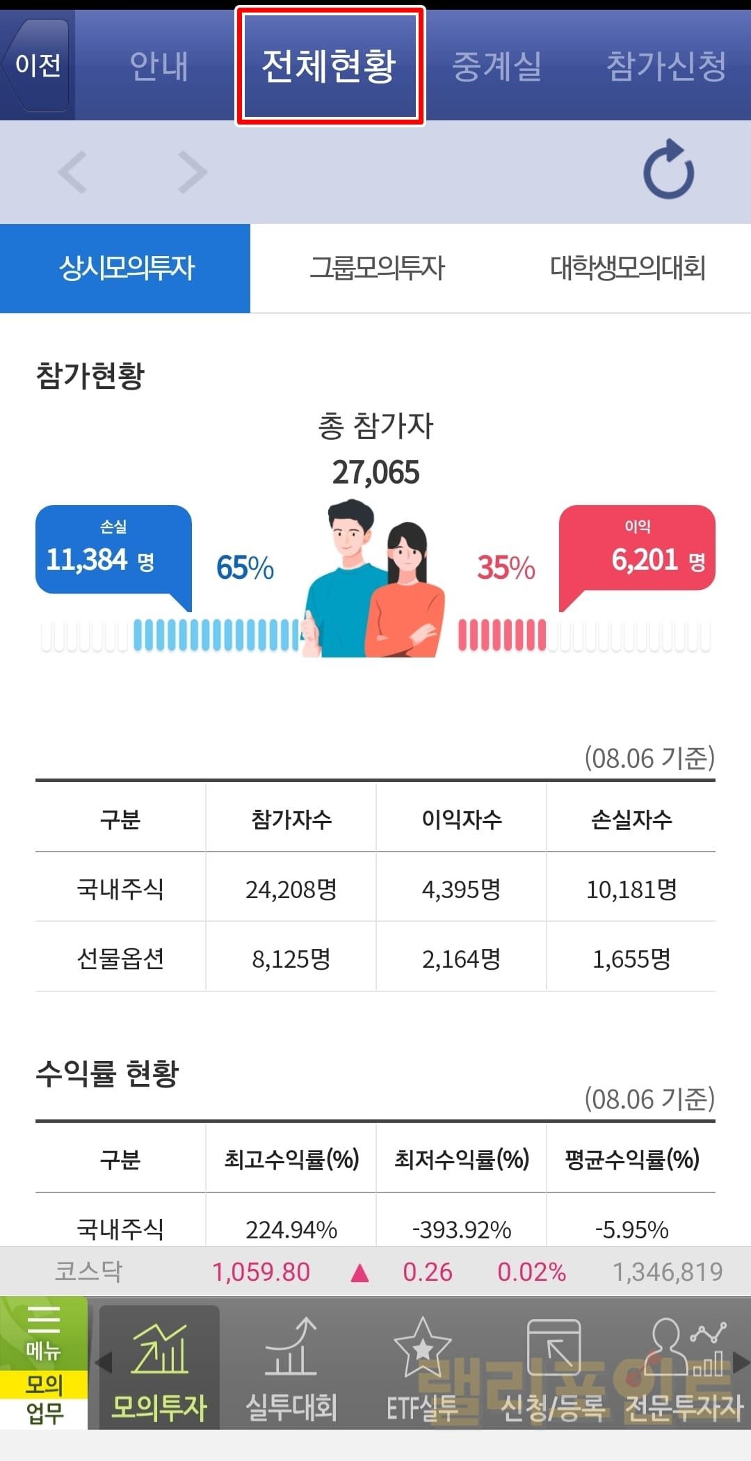 전체현황에서 모의투자 전체 참여자의 이익자 및 손실자수를 볼 수 있습니다.