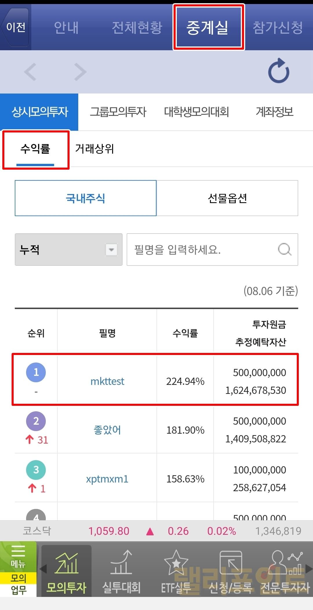 중계실에서 현재 영웅문 모의투자 수익률 순위를 볼 수 있습니다.