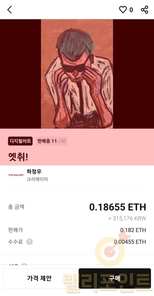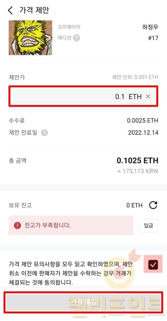 만약 구매 가격을 조절하고 싶으시다면 가격 제안 버튼을 클릭하시길 바랍니다. 이곳에서 제안가를 입력하여 크리에이터에게 발송할 수 있으며, 크리에이터의 수락 또는 조율에 따라 더 저렴한 가격에 NFT를 구매할 수 있습니다.