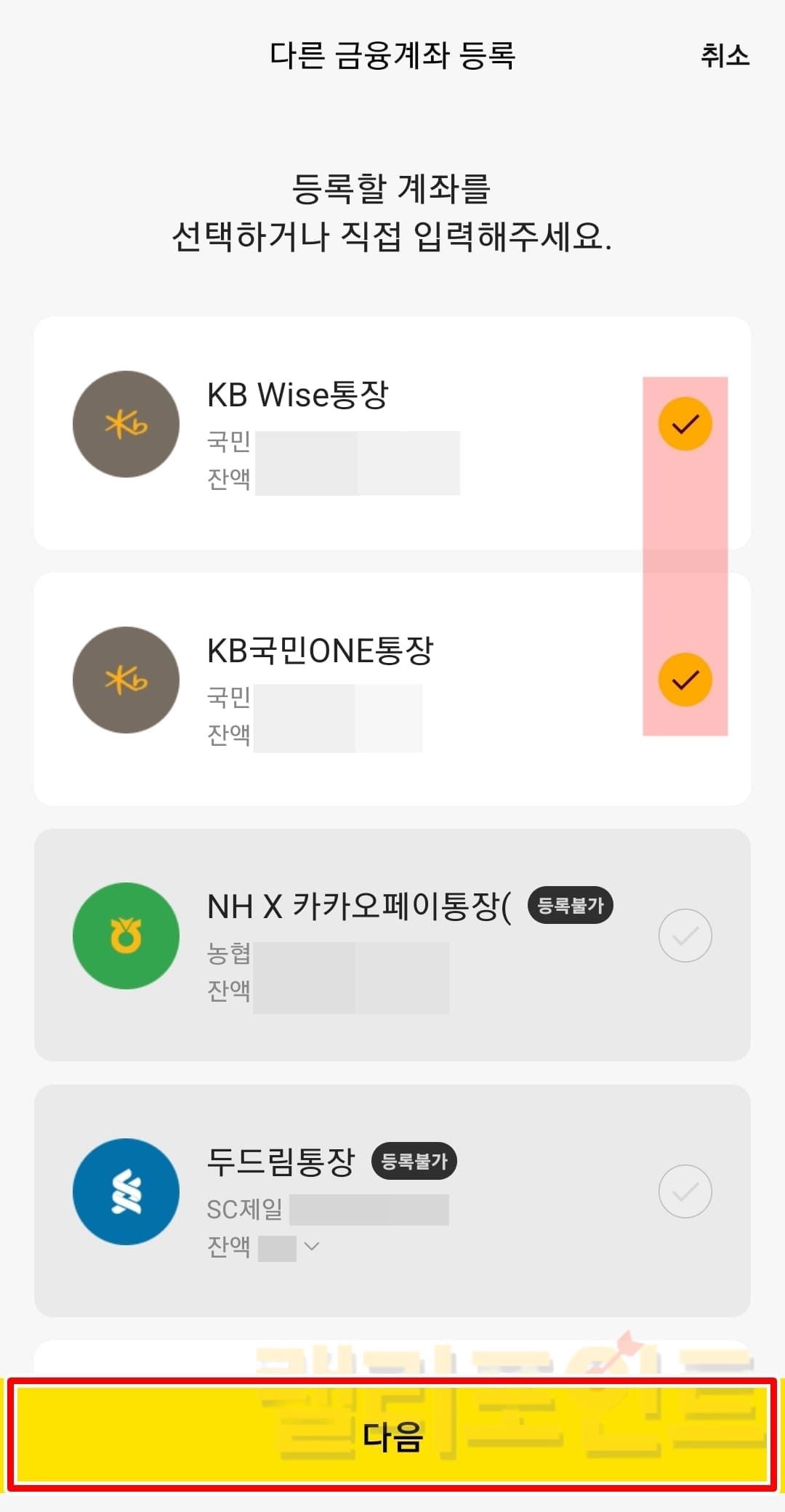- 등록할 계좌를 모두 체크하고 다음을 누릅니다.