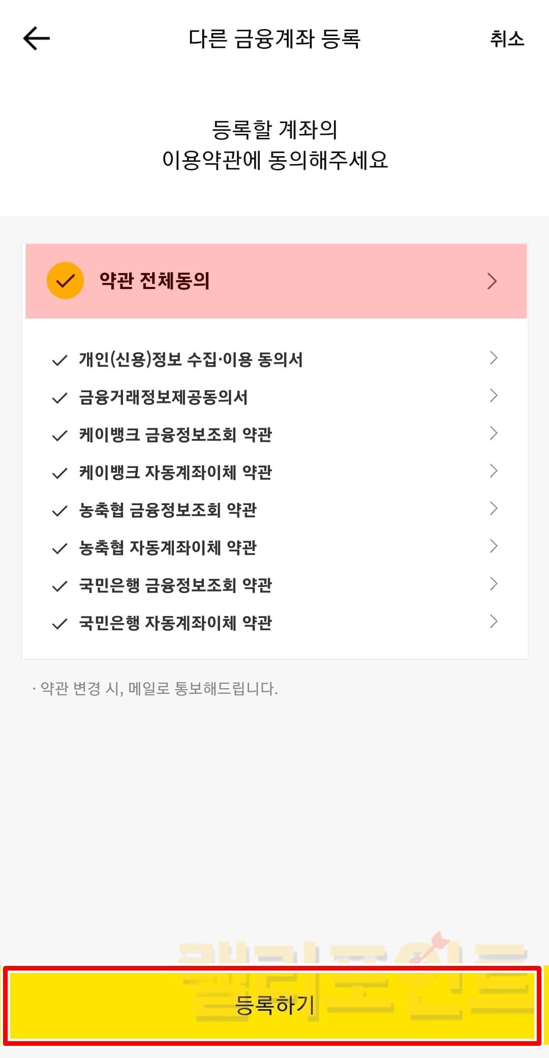 약관에 전체동의하고 등록하기를 클릭합니다.