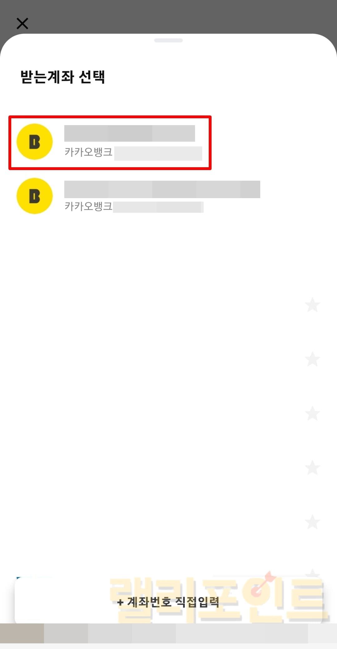 찾는 계좌가 목록에 없다면 하단에서 +계좌정보 직접입력을 눌러 은행과 은행계좌를 기입해주세요.