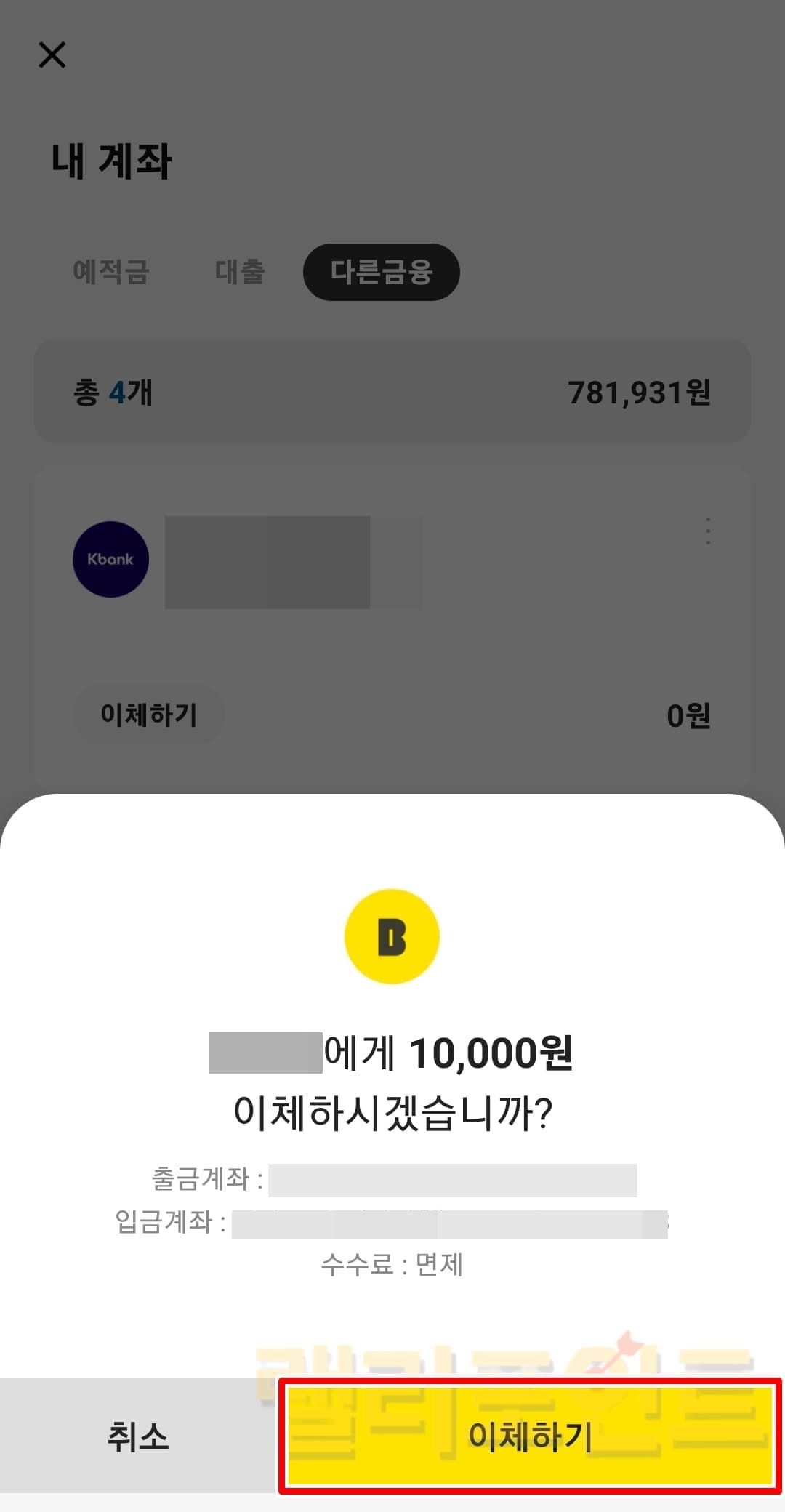 - 이체하기 버튼을 클릭합니다.