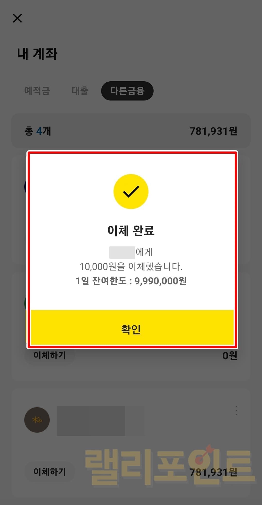 위 과정으로 이제 카카오뱅크 오픈뱅킹에 등록된 타행계좌라면 카카오뱅크 앱으로 금액확인, 송금이 가능해집니다.